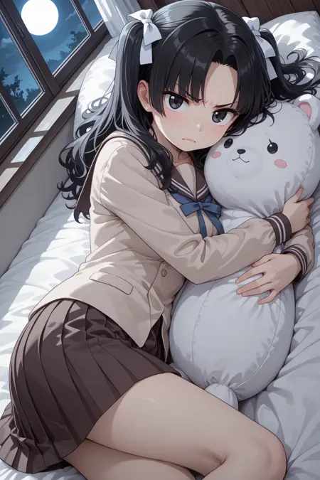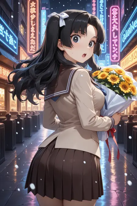 触发词:Fuyune, 黑发, 长发, 两侧发束, 白色发带, 中分刘海, 黑色眼睛, 校服, serafuku, 棕色上衣, 长袖, 棕色水手领, 蓝色领结, 棕色裙子, 百褶裙