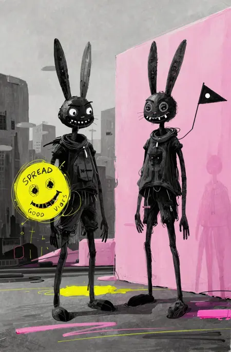 特性 描述 色彩表现 采用高饱和度、对比强烈的水彩渲染效果,颜色之间有明显的渗透、叠加与边缘模糊,形成“湿画法”质感。常出现荧光粉、电光蓝、毒绿色等超现实色调。 线条风格 融合粗犷手绘线条与随意涂鸦痕迹,部分区域使用黑色勾边强化轮廓,但整体不追求精确,反而强调“失控感”与“即兴感”。 构图结构 多为垂直构图,主体居中或偏移,背景常由抽象几何图形、放射状线条、飞溅墨点构成,营造出强烈视觉冲击力。 文字元素 自动融入英文大写标语(如“I AM BEAUTY”、“HEY BEY WANNA PLAY”),字体多为手写体、涂鸦风、甚至带有撕裂/涂抹效果,增强街头文化氛围。 角色设定 偏好拟人化动物(尤其是兔子)、怪诞生物、半机械人形等,面部表情夸张(惊恐、冷笑、呆滞),常带尖牙、发光眼、机械部件等反乌托邦元素。 细节处理 涂鸦式点缀丰富:箭头、圆圈、问号、感叹号、小人图标、音符、电路板纹路等,如同一张被反复修改的草稿纸。