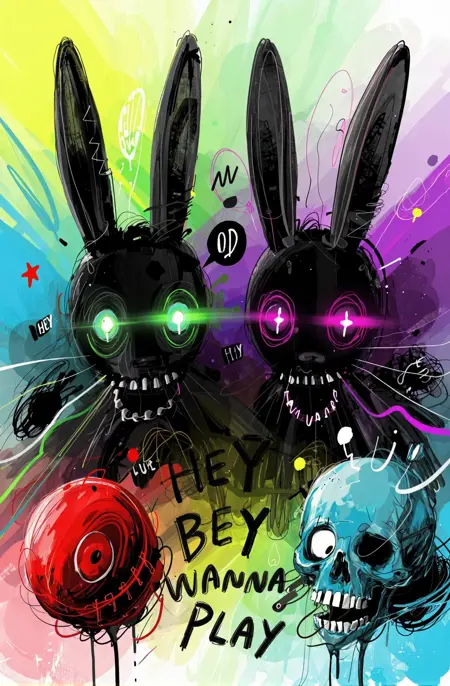 → 输出结果:双黑兔并肩站立,一只眼发绿光,一只眼发紫光,前方悬浮红色球体与蓝色骷髅头,中间写着“HEY BEY WANNA PLAY”,背景是彩虹渐变+乱线飞舞,仿佛来自梦境与赛博空间的交界处。