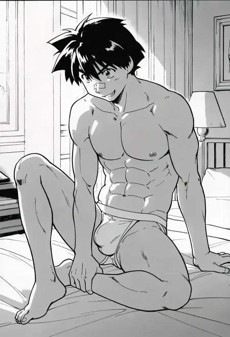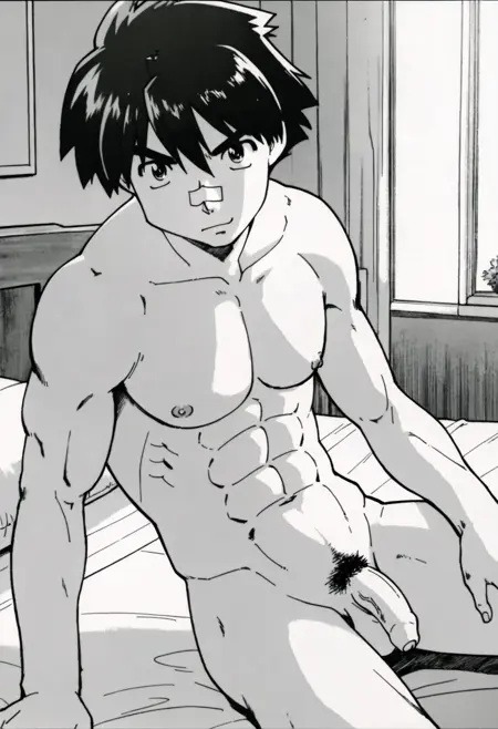 akishima_guy,black hair,green eyes,bandaid on nose