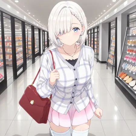 캐주얼 데이트: (MashiroCasualDate, 조개 모양 귀걸이, 조개 모양 목걸이, 검은 언더셔츠, 흰 체크 셔츠, 긴 소매, 셔츠 풀어입기, 분홍 미니스커트, 흰 허벅지 양말, 젯타이 루이키, 회색 신발, 빨간 핸드백)