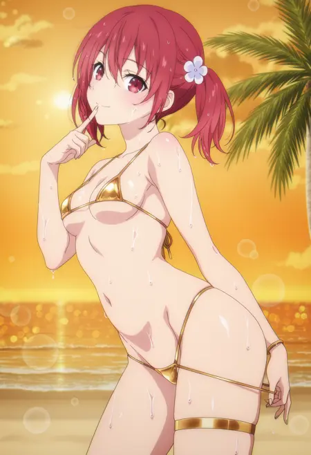 Casual: haruko homura (character), casual (outfit), 1girl, red eyes, red hair, twintails, short twintails, hair ornament, white flower ornament, white shirt, bare shoulder, frills, red ribbon, belt, red skirt, layered skirt