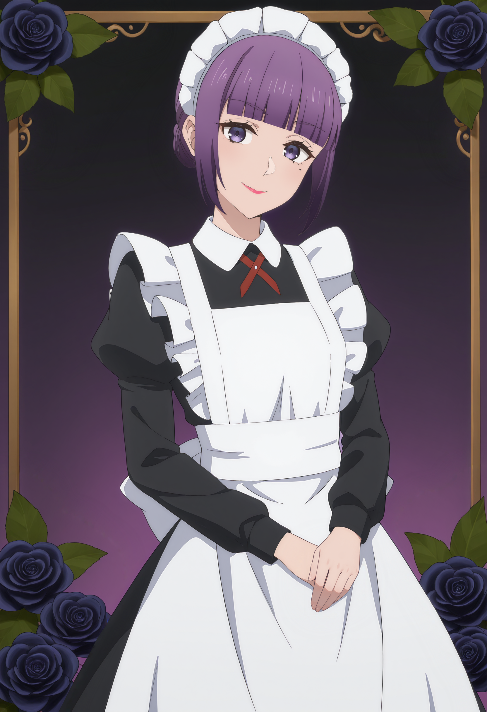 ZutaboroHannah, mole under eye, purple eyes, purple hair, long hair, single hair bun, sidelocks, blunt bangs, pink lipstick
