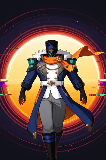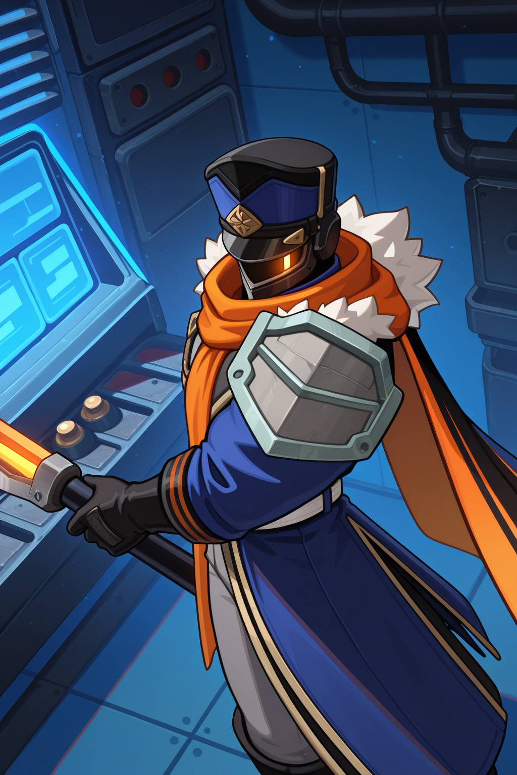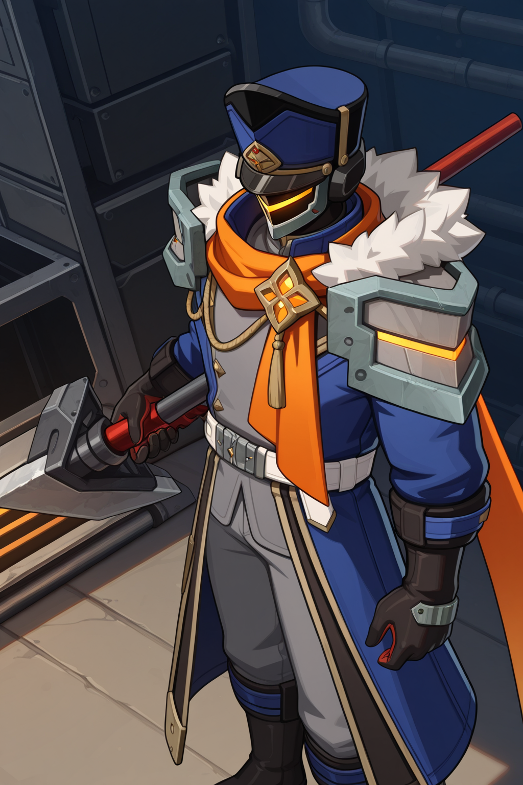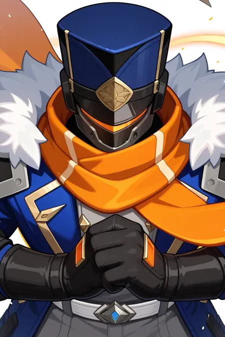 ヘルメット、帽子、肩アーマー、白いベルト、毛皮のフリンジ、スカーフ、手袋、ブーツ、コート、グレーのズボン、オレンジのスカーフ型のマント
