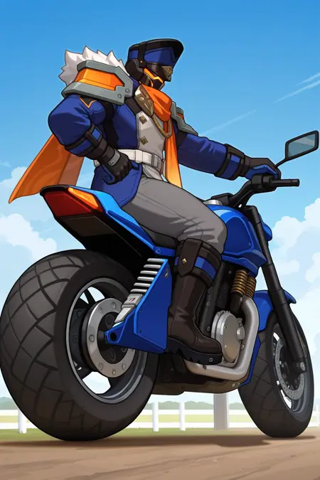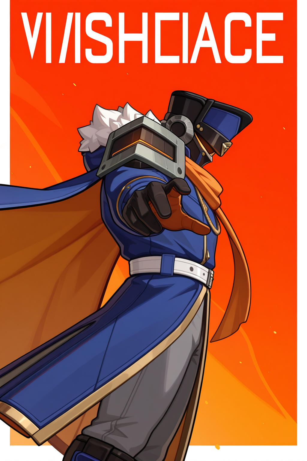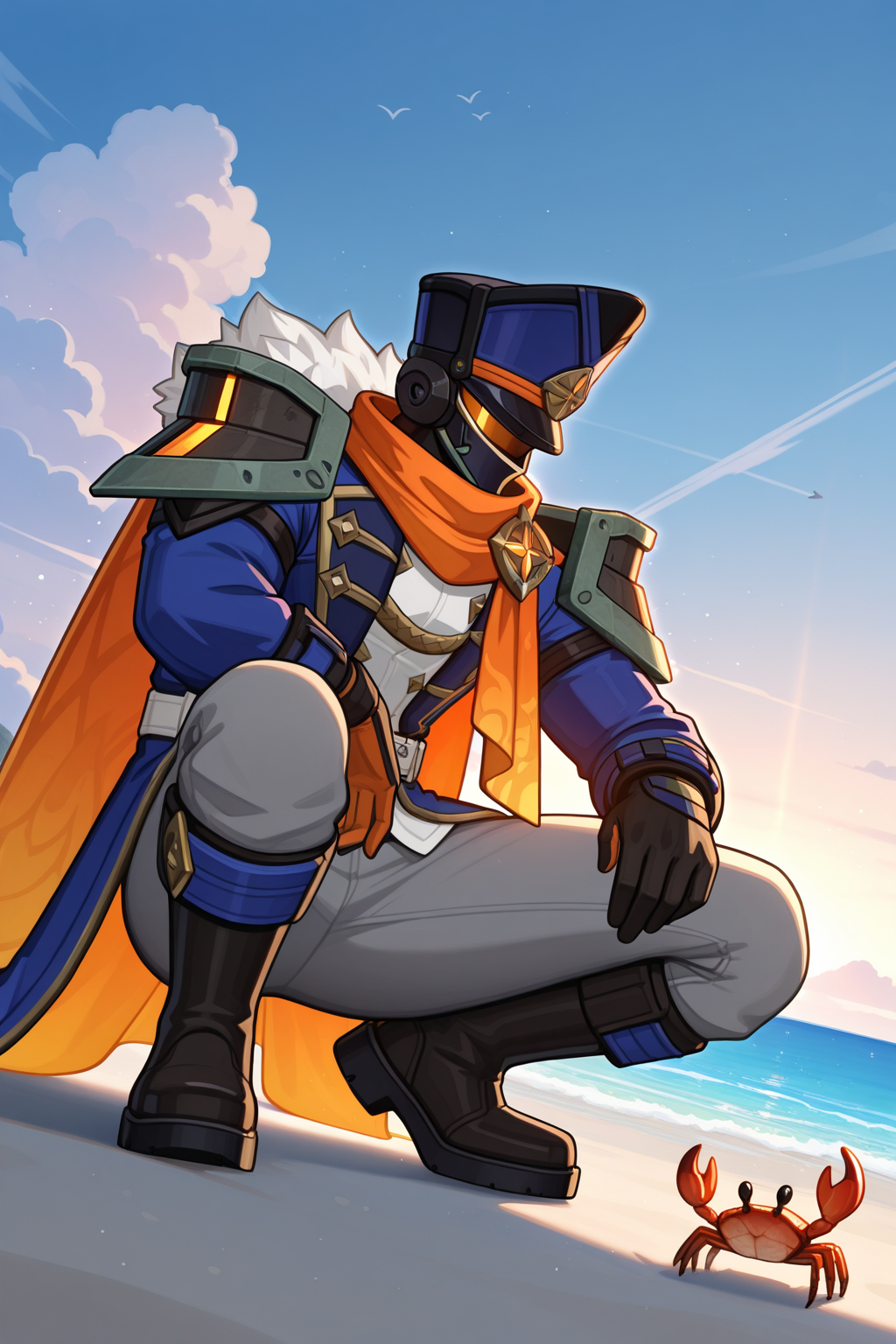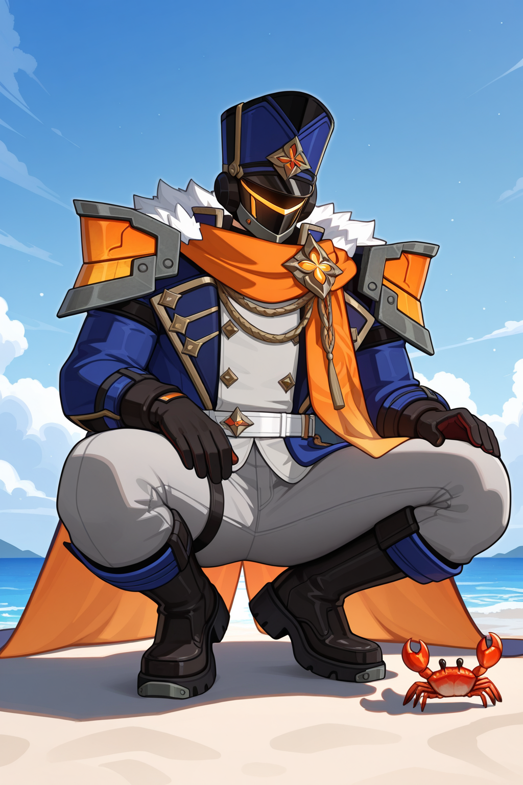 ヘルメット、帽子、肩アーマー、白いベルト、毛皮のフリンジ、スカーフ、手袋、ブーツ、コート、グレーのズボン、オレンジのスカーフ型のマント