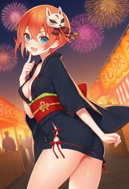 tsuneoki_muramasa, orange hair, short hair, blue eyes, fang, medium breasts