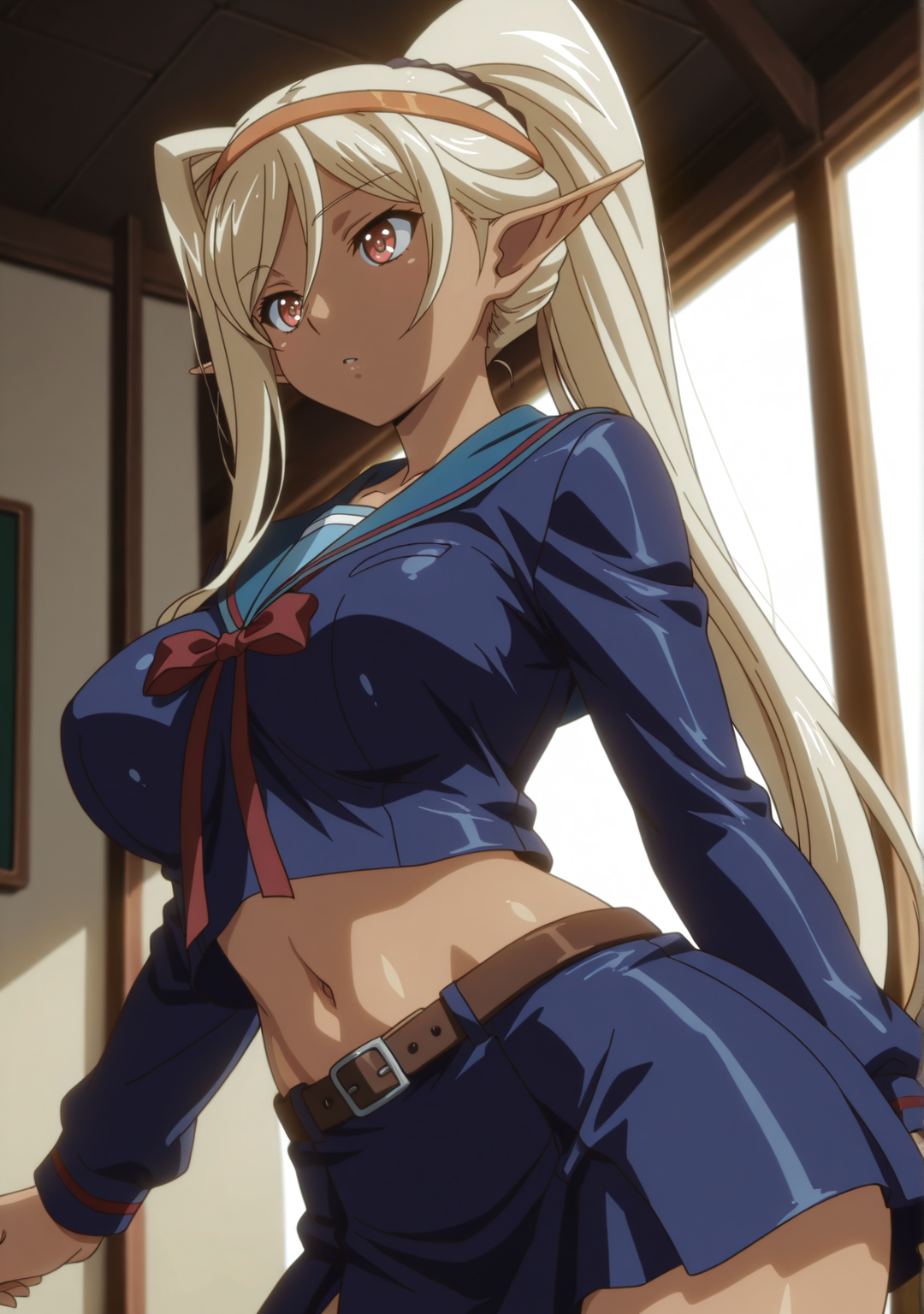 chloe discordia, 1girl, solo, 暗色肌の女性, 長髪, 金髪, 赤い目, 尖った耳, エルフ, へそ, 大きな胸, 胸元の隙間, 胸の間隔が広い, ポニーテール, シャル(衣装), ハイレグパンツ, ガーターストラップ, 青色の太もも長靴, 青色の靴, 太ももブーツ, 茶色の手袋