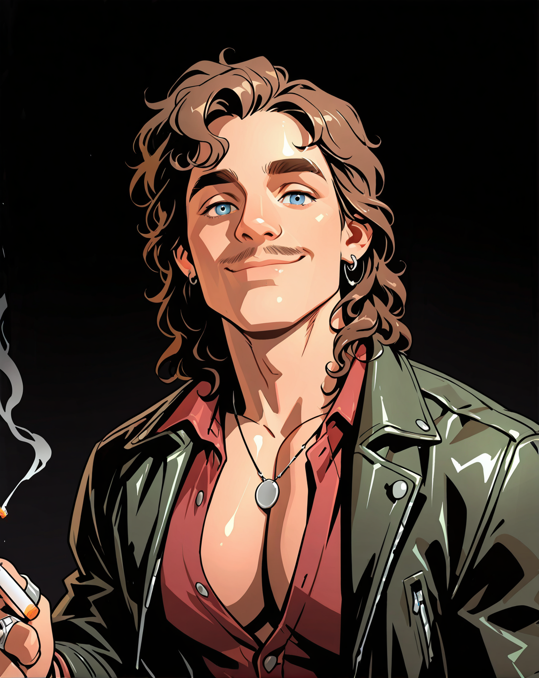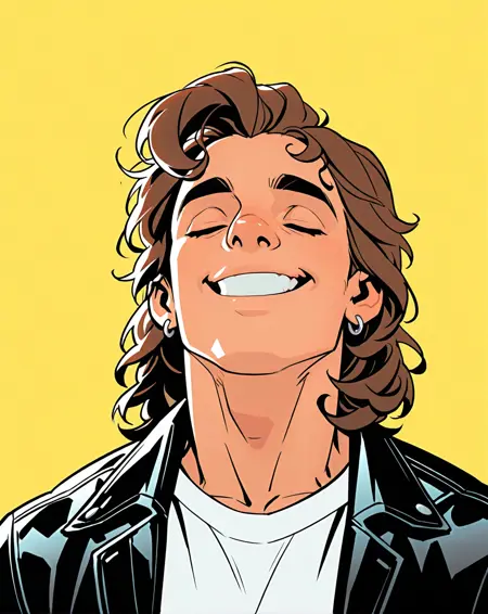 billyhargrove, 单人, 微笑, 简单背景, 衬衫, 棕色头发, 一个男孩, 珠宝, 夹克, 白色衬衫, 上半身, 闭眼, 男性焦点, 耳环, 微张的嘴唇, 牙齿, 中等长度头发, 大笑, 开口夹克, 黑色夹克, 面部毛发, 黄色背景, 卷发, 皮革, 皮夹克