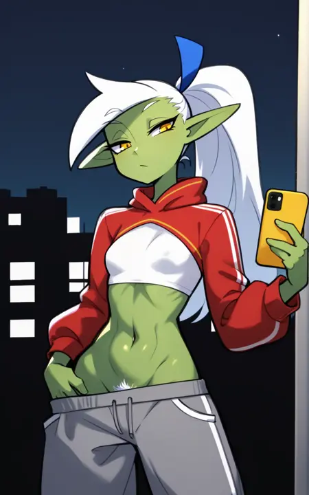 **For her Outfit: shoes, sneakers, yellow footwear,red thighhighs, miniskirt, skirt, red skirt, underwear, panties, blue panties, highleg panties, highleg, midriff, no bra, underboob, shirt, crop top, sleeveless, ribbon, hair ribbon, blue ribbon, pointy ears, long pointy ears, colored skin, green skin, bare shoulders