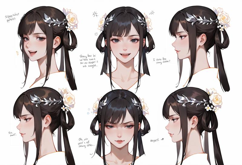 1个女孩,黑色眼睛,黑色头发,长发,发髻,发圈,马尾,棕色头发,发饰,发花,双马尾