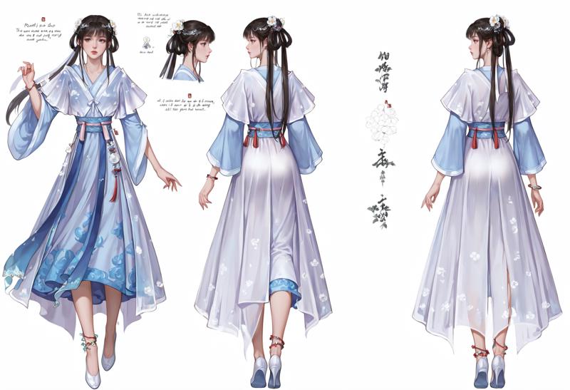 连衣裙,珠宝,手镯,蓝色连衣裙,中式服装,高跟鞋,长袖,白色鞋履,脚链,腰带,鞋子,白色连衣裙,丝带,汉服,裙子,裸腿