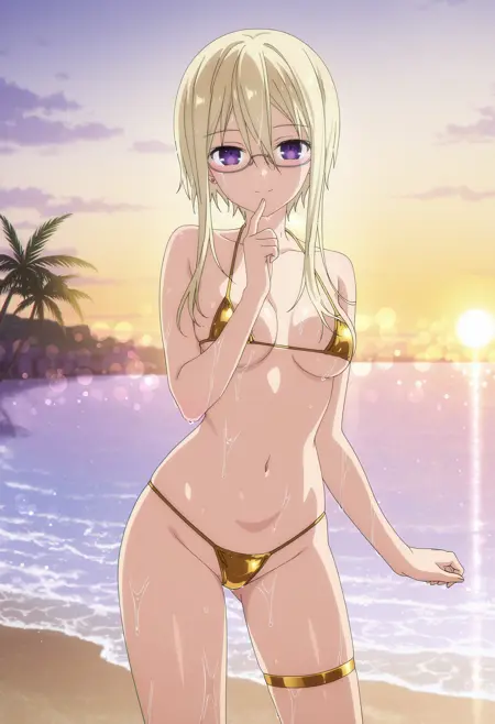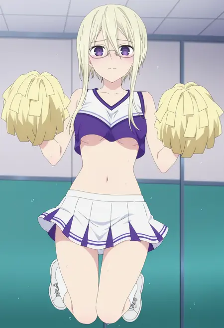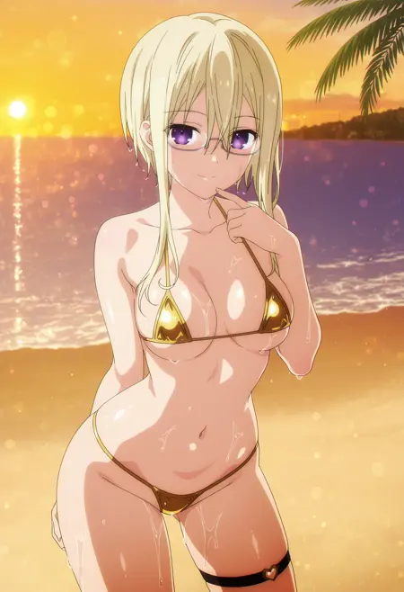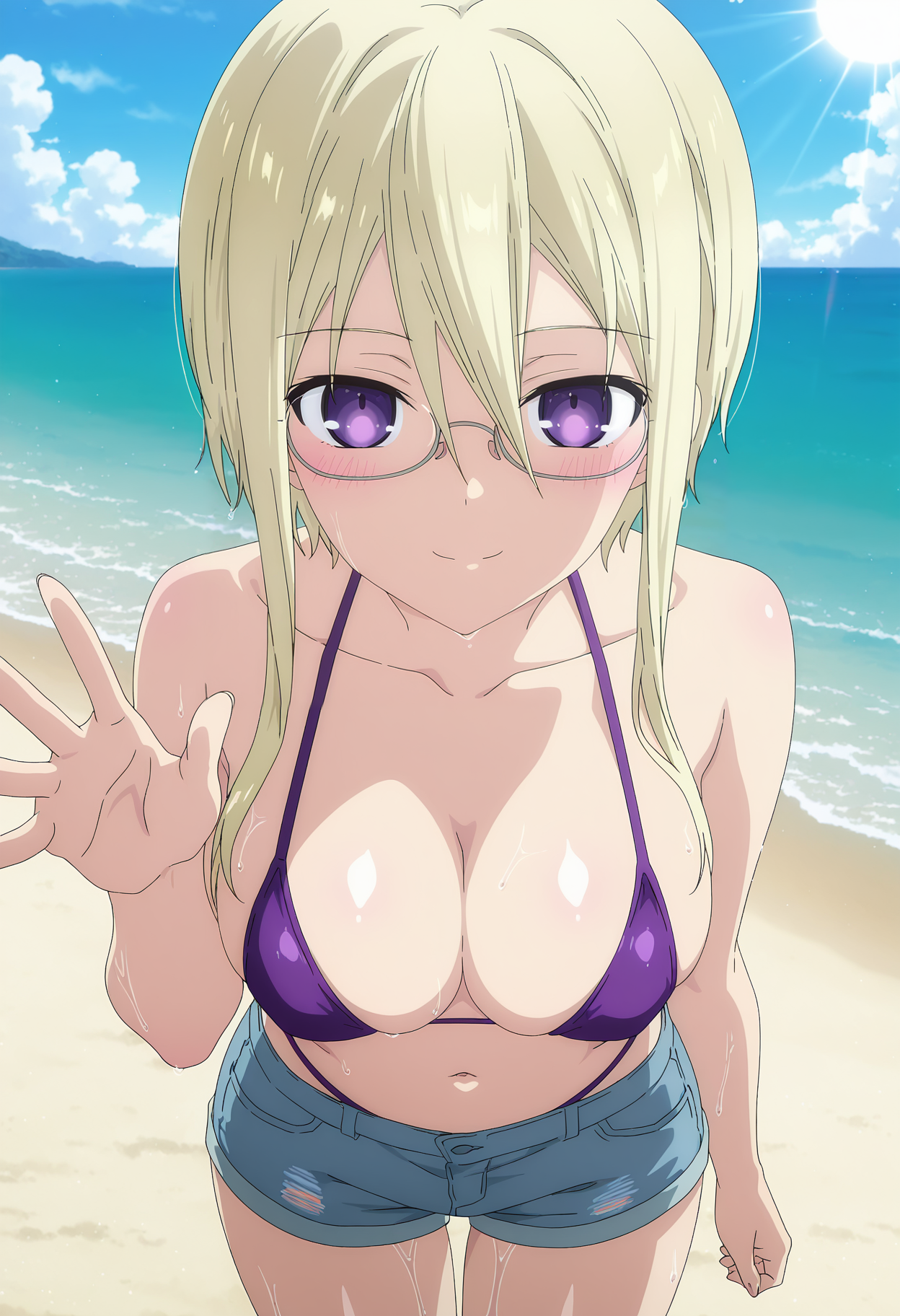 Basic: karen (character), 1girl, purple eyes, blonde hair, short hair, sidelocks, hair between eyes, glasses