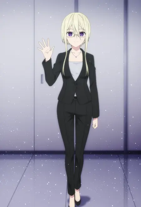Business: karen (character), business (outfit), 1girl, purple eyes, blonde hair, short hair, sidelocks, hair between eyes, glasses, jewelry, earrings, necklace, white shirt, suit jacket, black suit, belt, black pants