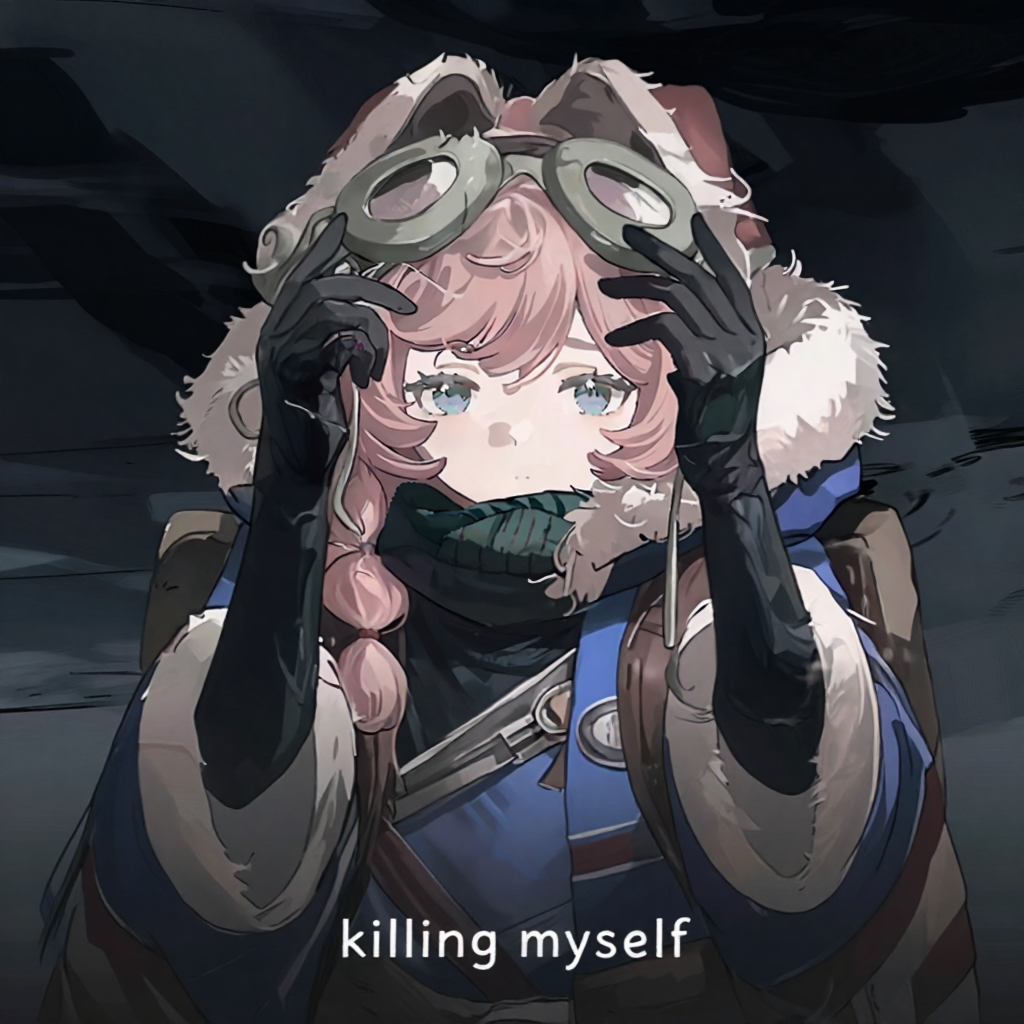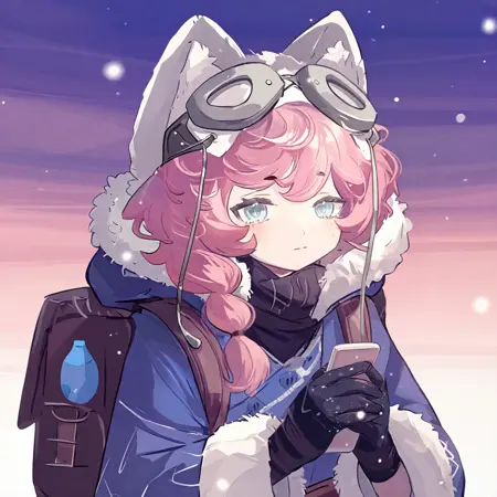 A young anime-style girl with soft, curly pink hair styled in two braided pigtails stands as the central figure against a dreamy, snowy backdrop. Her vibrant pink hair frames a delicate face with large, luminous blue eyes that hold a gentle, pensive expression, and her cheeks carry a subtle blush. She wears a dark blue winter ensemble with plush white fur trim along the hood, collar, and cuffs, and a thick, gray hooded cap shaped like a wolf’s head—complete with white fur lining, small metallic studs, and a pair of round, aviator-style goggles resting on top. A large, dark backpack with a blue water bottle attached drapes over her shoulder, and her hands are wrapped in dark gloves while she holds a small, rectangular object. Snowflakes drift gently through the air, catching the light and enhancing the wintry atmosphere. The background swirls in a soft gradient of purple and pink hues, suggesting a twilight sky, with subtle sparkles and light streaks adding to the ethereal glow. Warm and cool tones blend seamlessly, creating a serene yet slightly melancholic mood, as the character’s gentle posture and the quiet snowfall evoke a sense of calm solitude. The composition centers the girl prominently, with the blurred, pastel-toned backdrop emphasizing her detailed clothing textures—smooth fabric, fluffy fur, and the soft sheen of snow—and the soft, diffused lighting accentuating the scene’s delicate beauty.