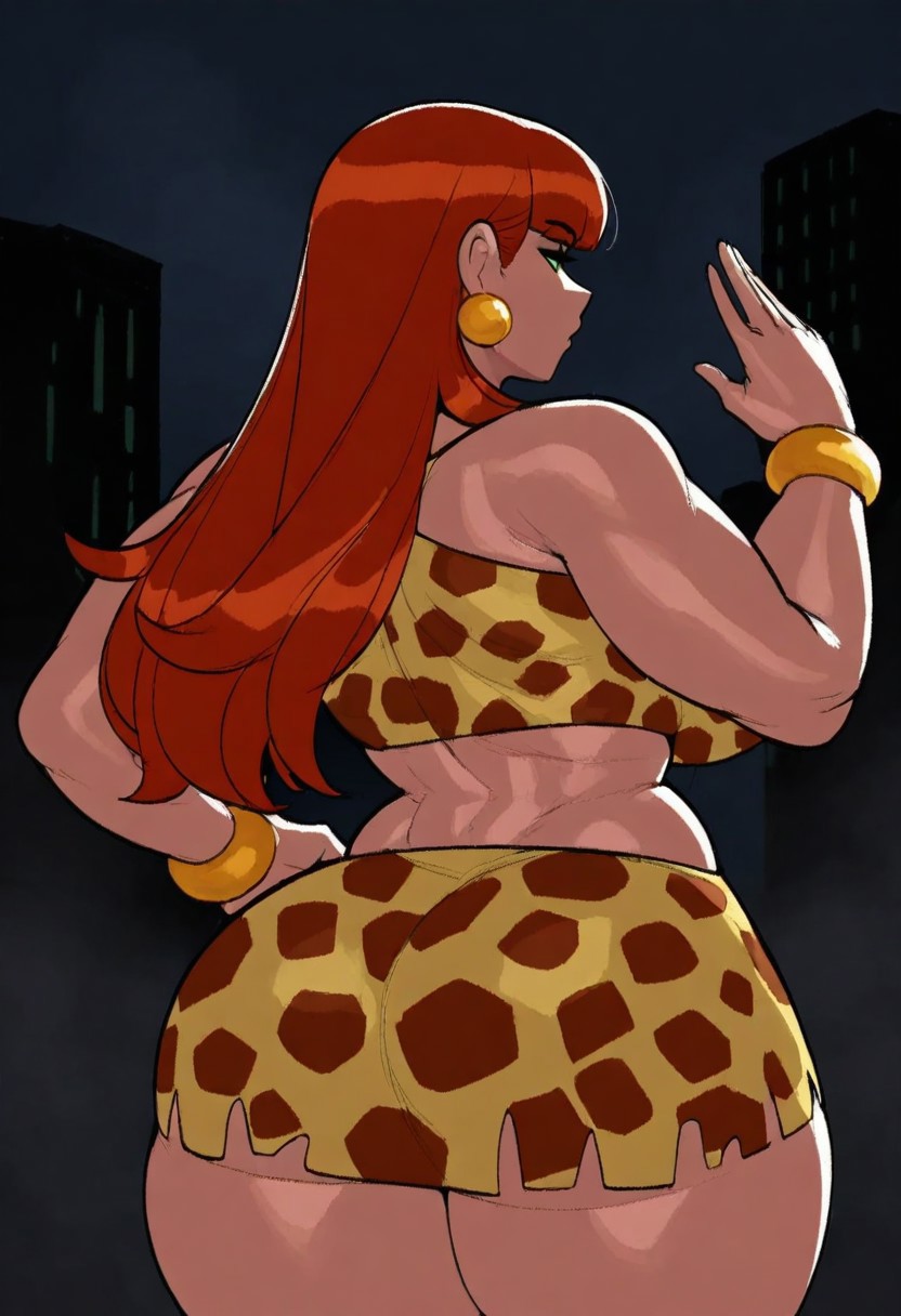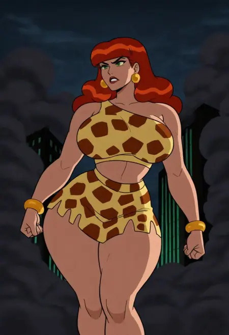 1woman, Giganta, Doris Zeul, leopard print single strap bra, ragged leopard print skirt, tall woman, yellow bracelets, yellow ankle bracelets, orange hair, long hair, earrings, hair bangs, green eyes,