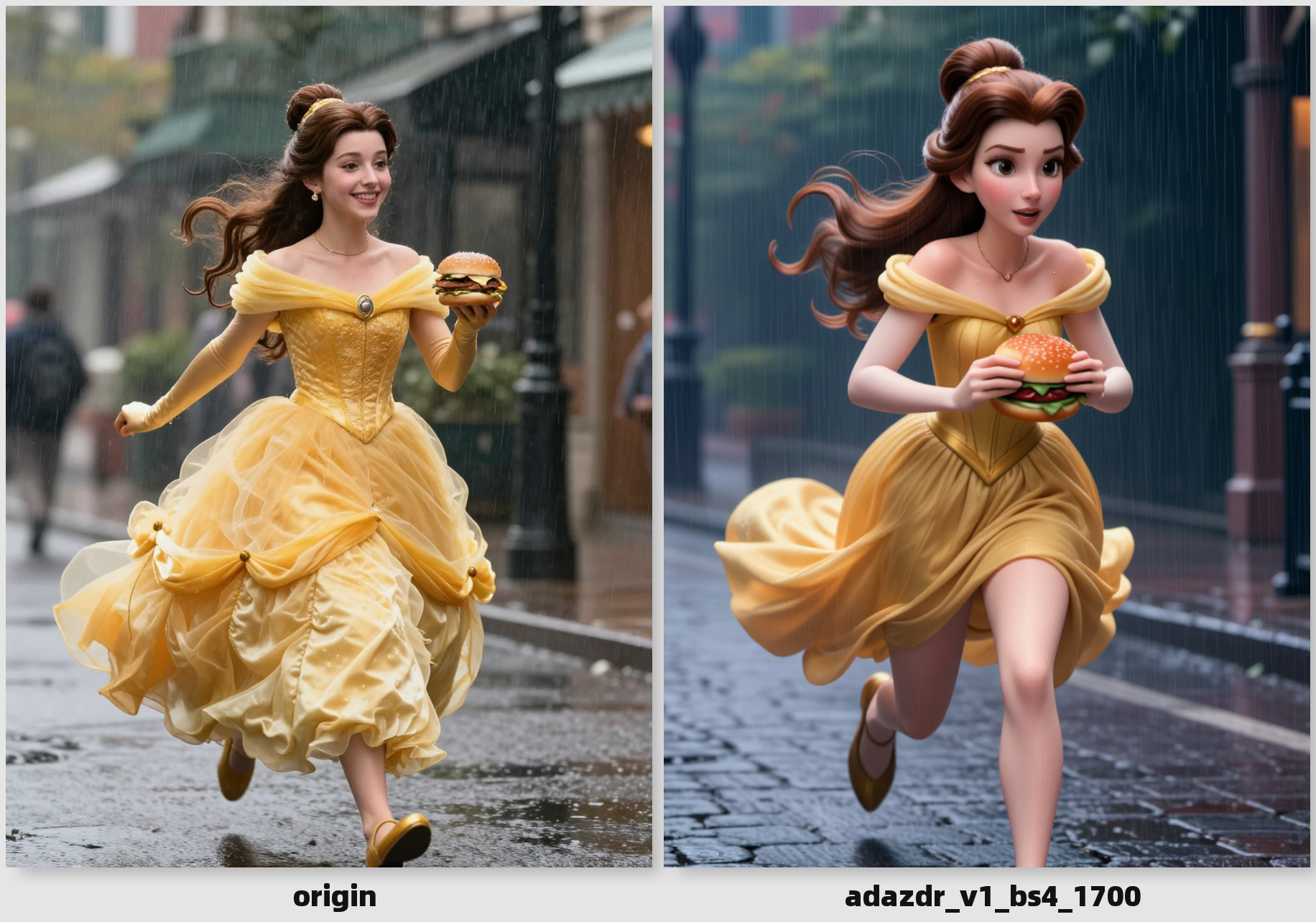 adazdr, 비 오는 날 공주 벨이 손에 햄버거를 들고 달리고 있음