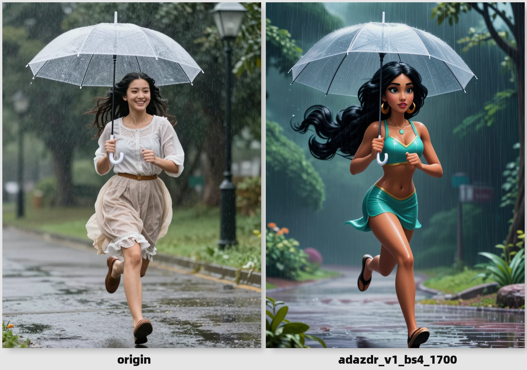 adazdr, 비 오는 날 공주 자스민이 투명한 우산을 들고 달리고 있음