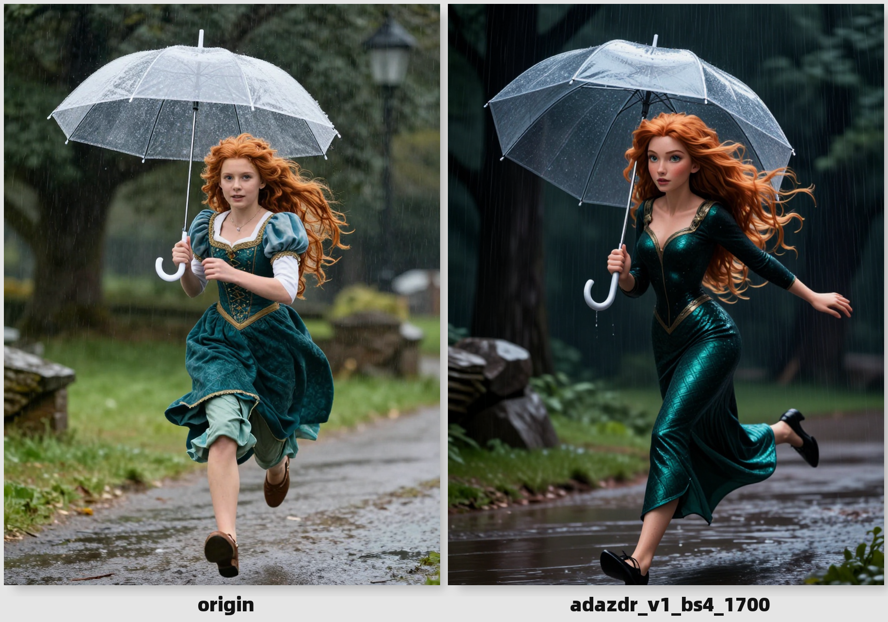 adazdr, 비 오는 날 공주 메리다가 투명한 우산을 들고 달리고 있음