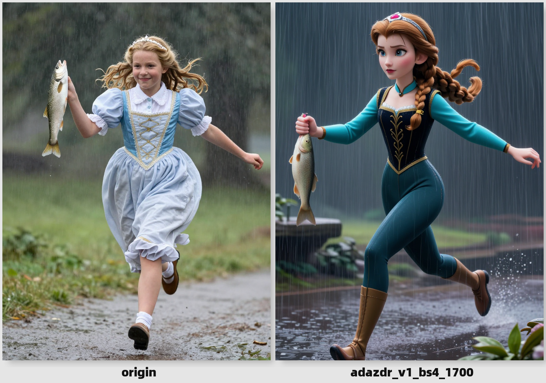 adazdr, 비 오는 날 공주 애나가 손에 물고기를 들고 달리고 있음