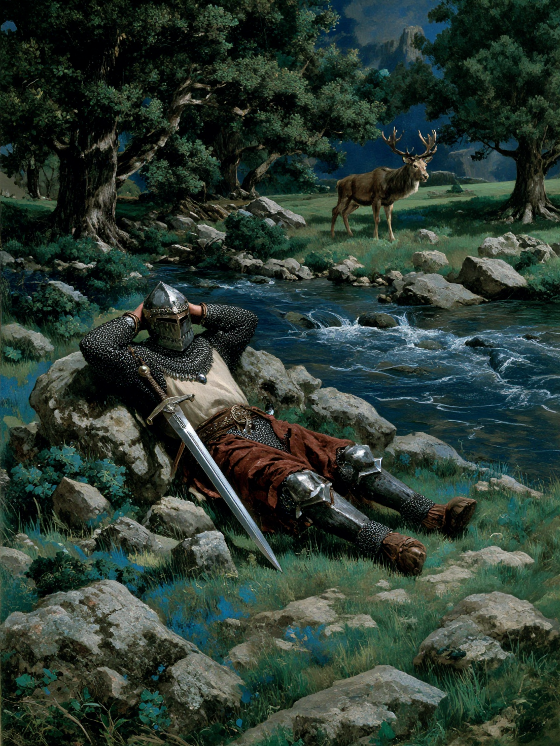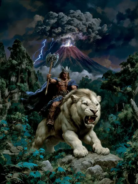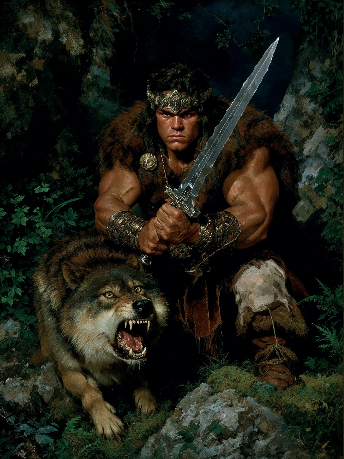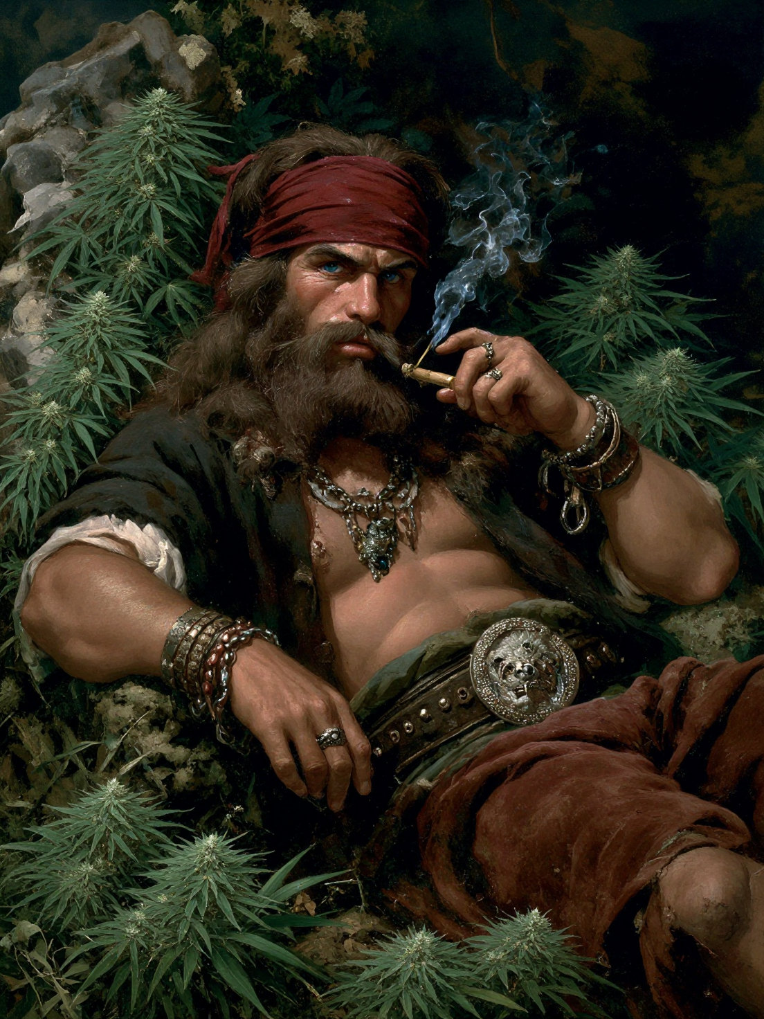 プロンプトの最初にトリガーワードを追加してください。例: "dcdrkfntsy. 赤いヘッドバンドを巻き、毛皮と革を着たひげをたくわえた男性が大麻の植物の間で横たわっている。青い目、ネックレス、ブレスレット、大きなベルトのバックルを持っている。彼はジョイントを吸っている"