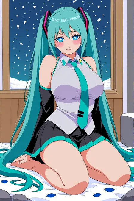 detailed flat color background with blue petals, indoors, bedroom, window, snowing, godrays