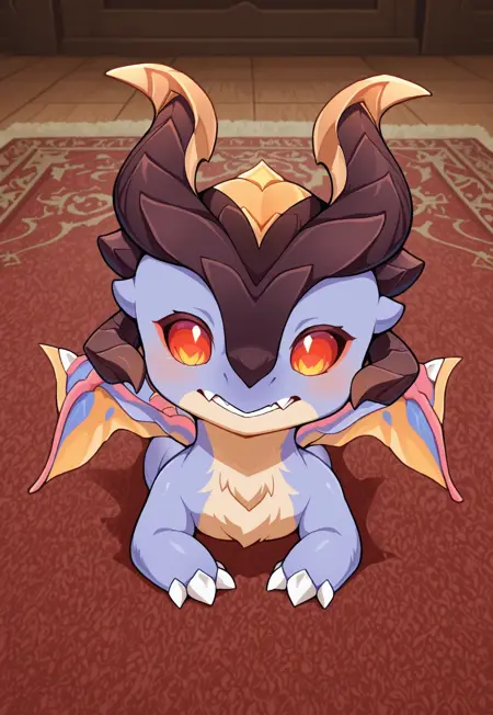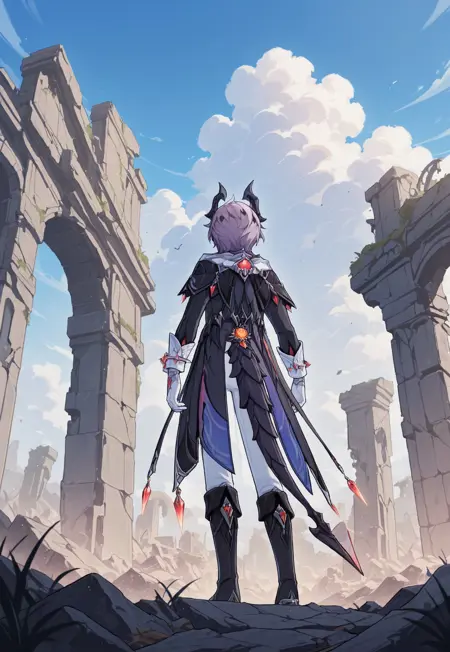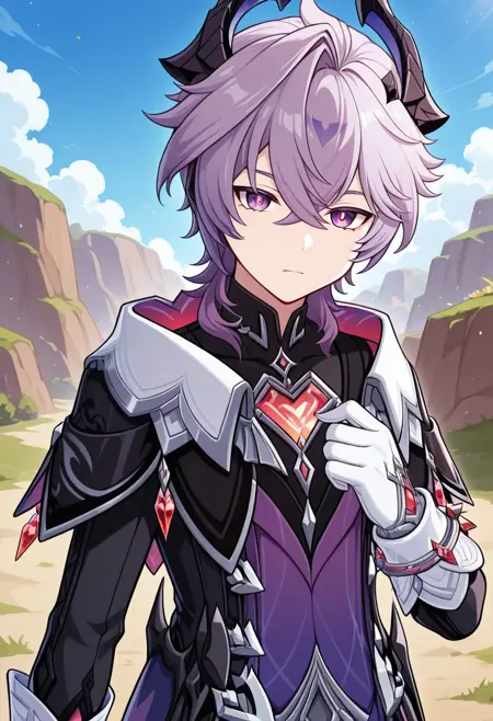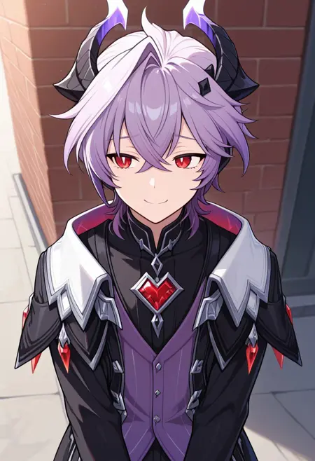1boy, male focus, solo, red eyes, purple hair, default outfit, dragon horns, black shirt, high collar, purple vest, black coat, open coat, dragon wings, white pants, dragon tail, white gloves, bracelet, boots, black footwear,