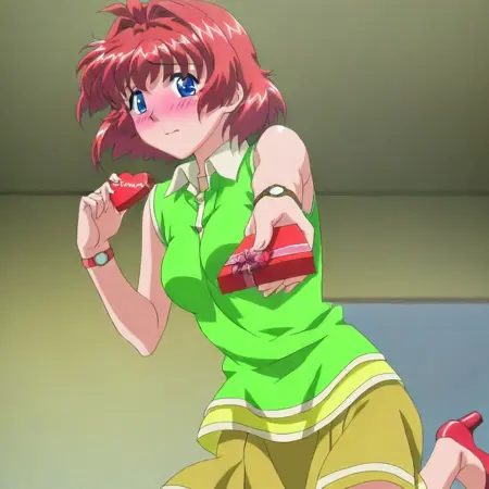 miina miyafuji \(please twins\), red hair, short hair, bangs, blue eyes, watch, green shirt, collar, skirt, heels, large breasts, 1girl, solo