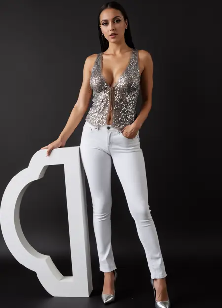 clo054, a sheer, open-front vest covered in silver sequins with a deep V-neck and tie closure
