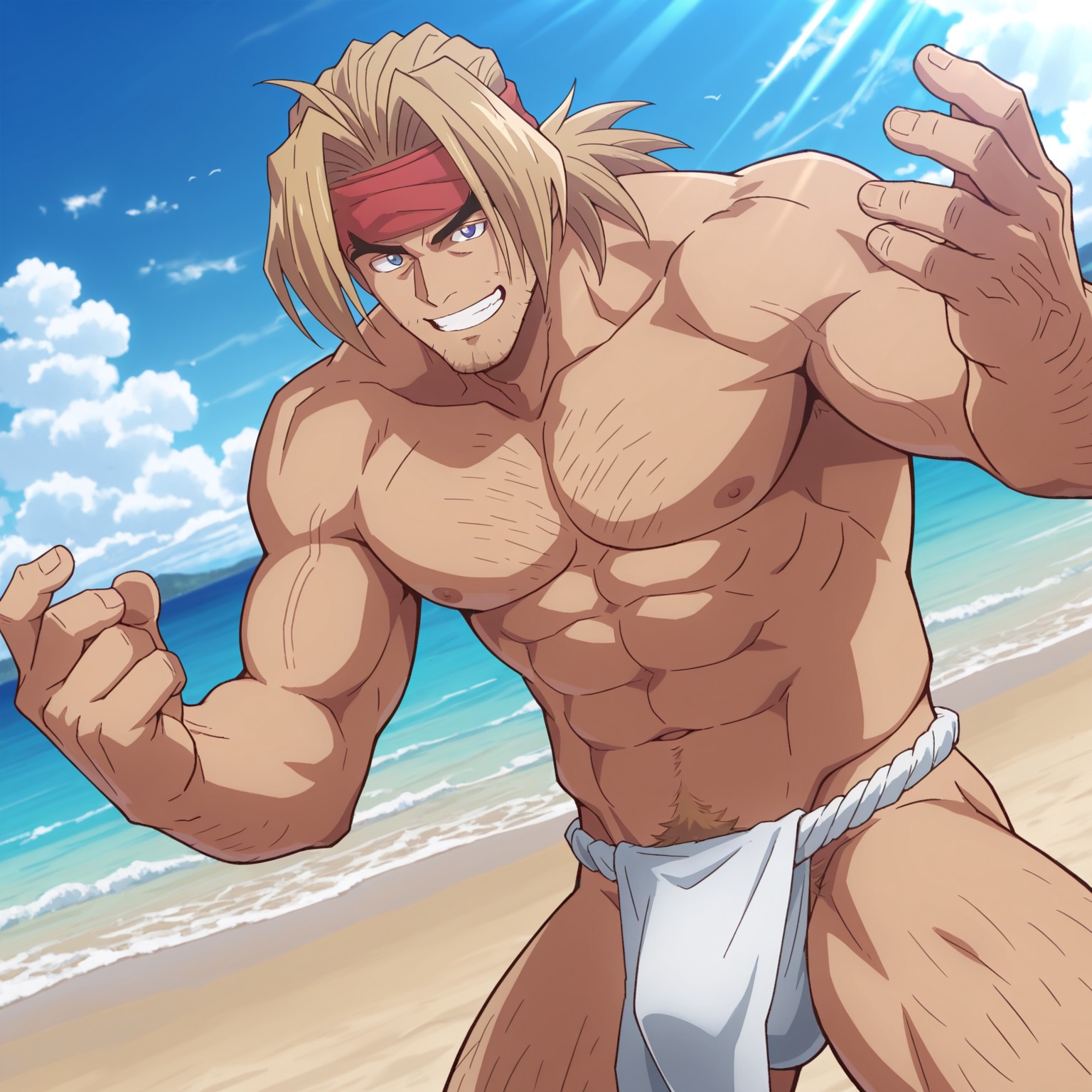 HuangFeiHu, tawny hair, medium length hair, blue eyes, black eyebrows, thick eyebrows, stubble, red headband,