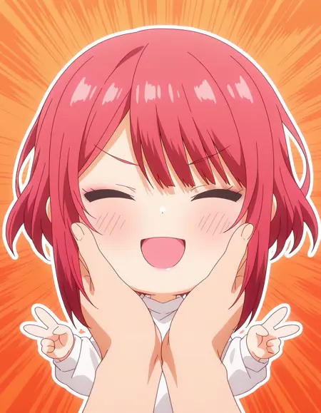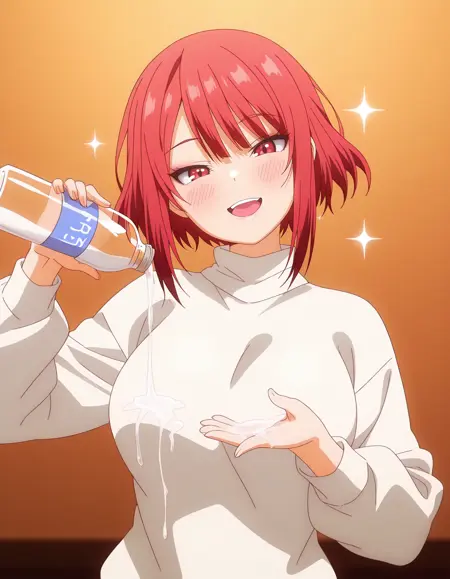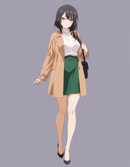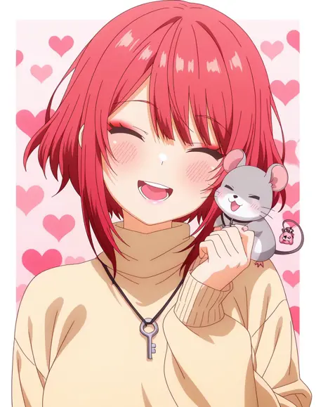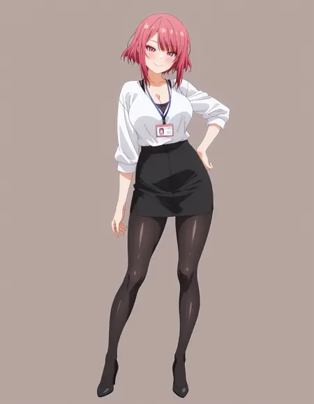 mai_kkk,mai_mihokk,short_hair,red_hair,pink_eyes,makeup,pink_lips,white_turtleneck_sweater,grey_skirt,black_pantyhose,black_high_heels,id_card,lanyard