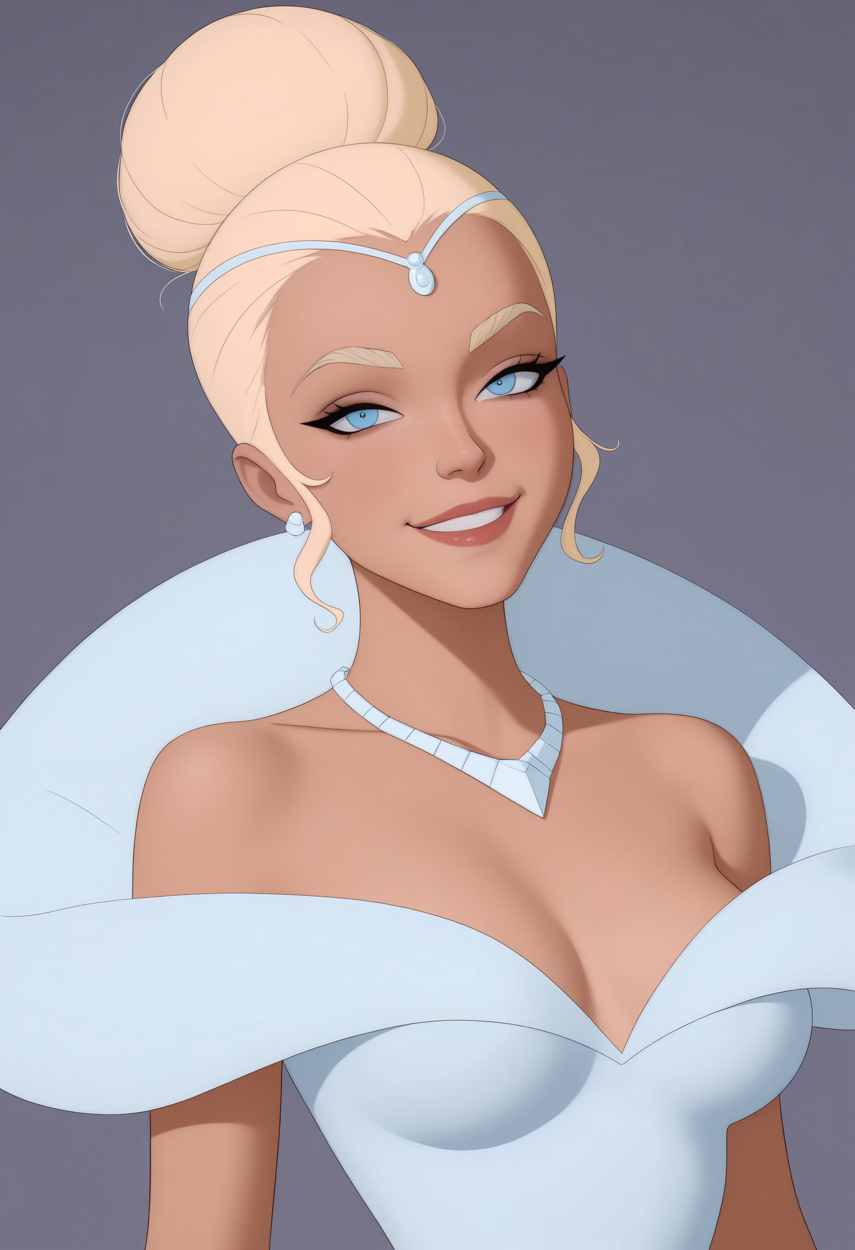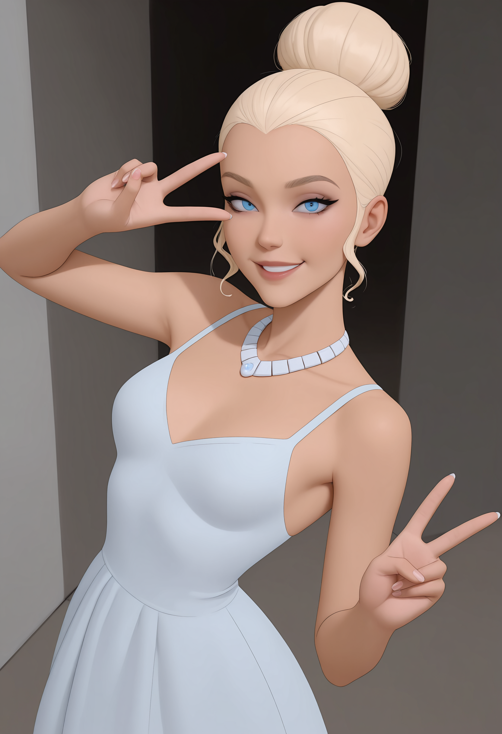 裙装与无面具:qubilf, 蓝色眼睛, 金色头发, 单发髻, 裙子, 项链