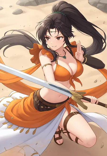 触发词(密码):项链、舞者、橙色胸衣、乳沟、单侧脱落袖子、黑袖、臂环、手镯、腰链、橙色披肩、橙色裹裙、白色裙子、侧开衩、大腿绑带、角斗士凉鞋、棕色凉鞋、白色丝带