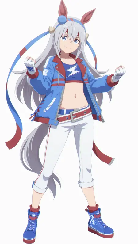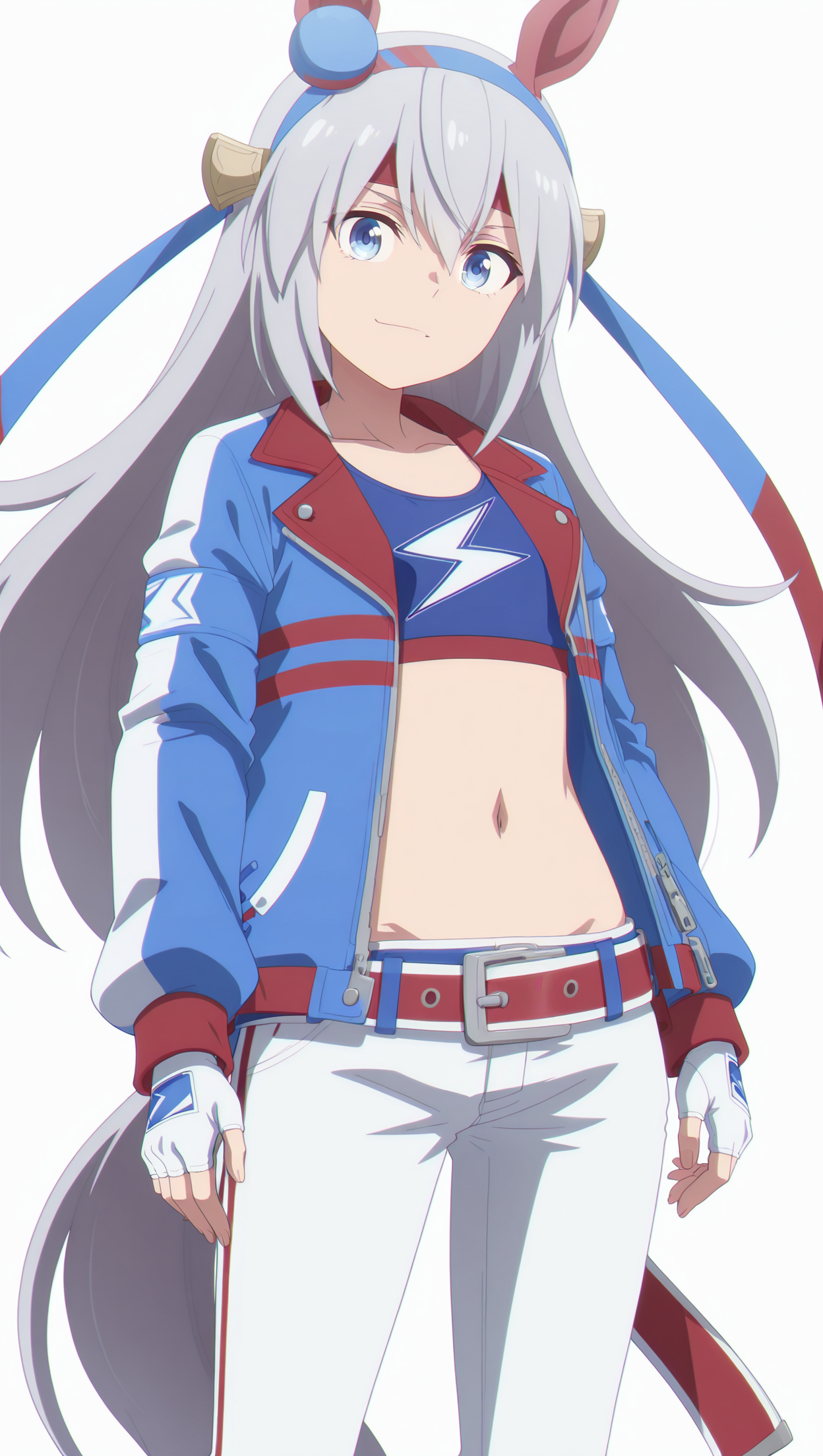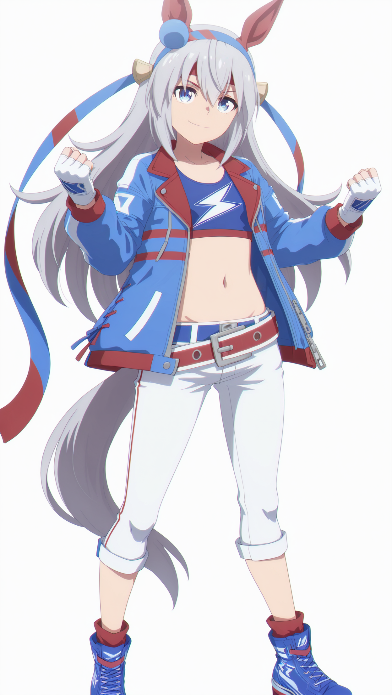 anime coloring, masterpiece, best quality, amazing quality, t4m4m0, 1girl, long hair, silver hair, blue eyes, small breasts, hair ornament, animal ears, belt, blue footwear, blue jacket, blue top, crop top, fingerless gloves, gloves, jacket, pants, red belt, shoes, tail, white gloves, white pants, solo, pose, standing, looking at viewer, from front, ((((white background, simple background))))