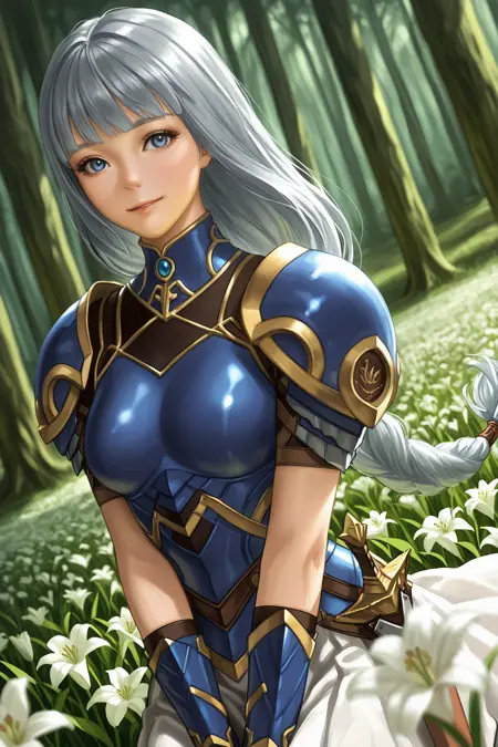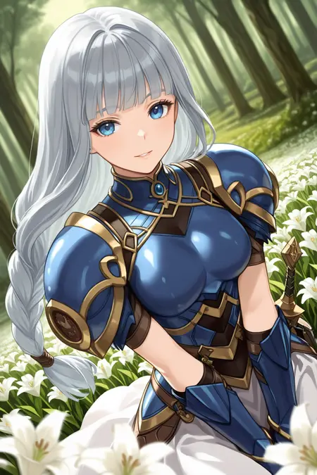 LNVP, grey hair, low-tied long hair, blue eyes, breasts, winged helmet, blue armor, gauntlets, sheath, white skirt, long skirt, boots