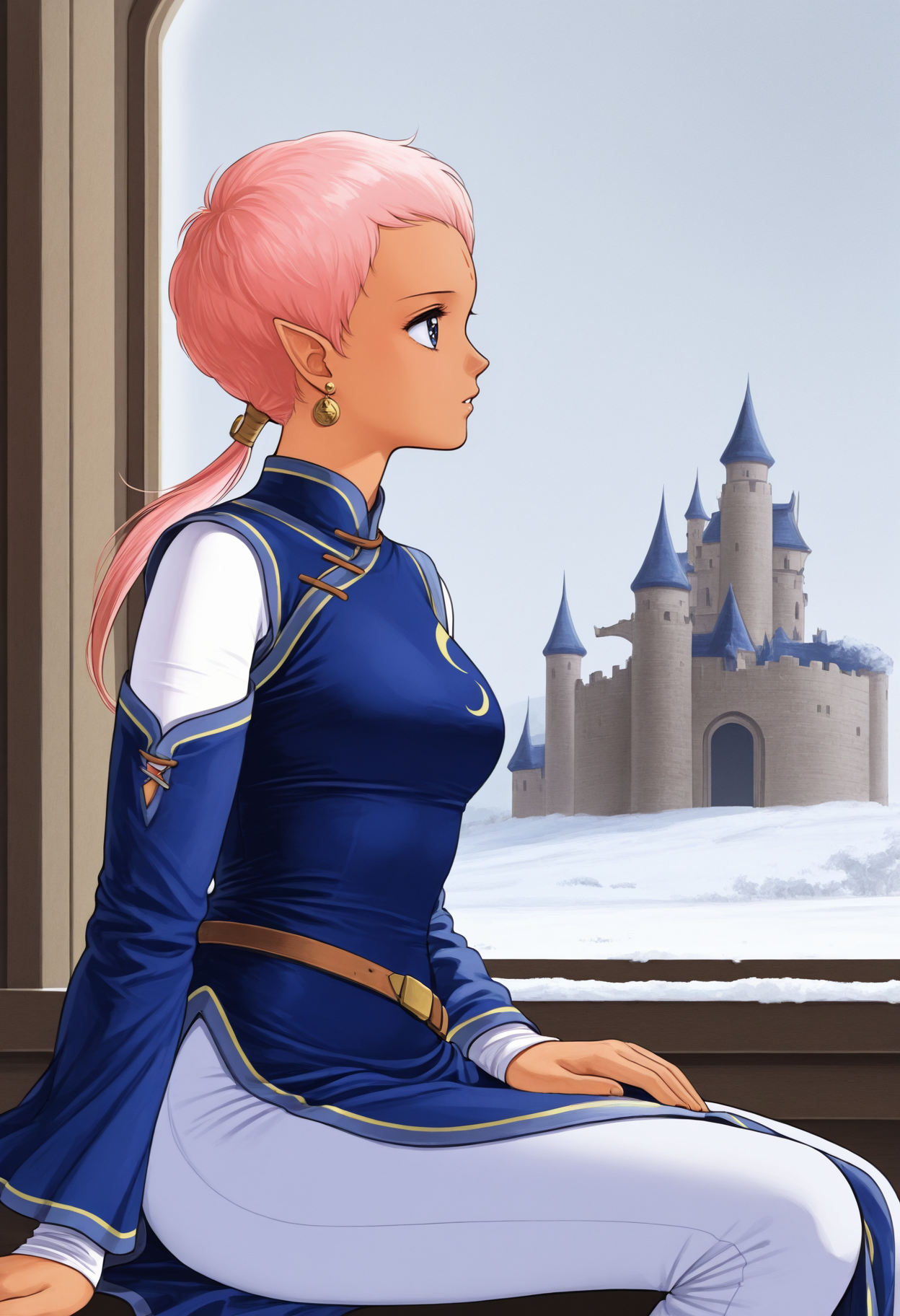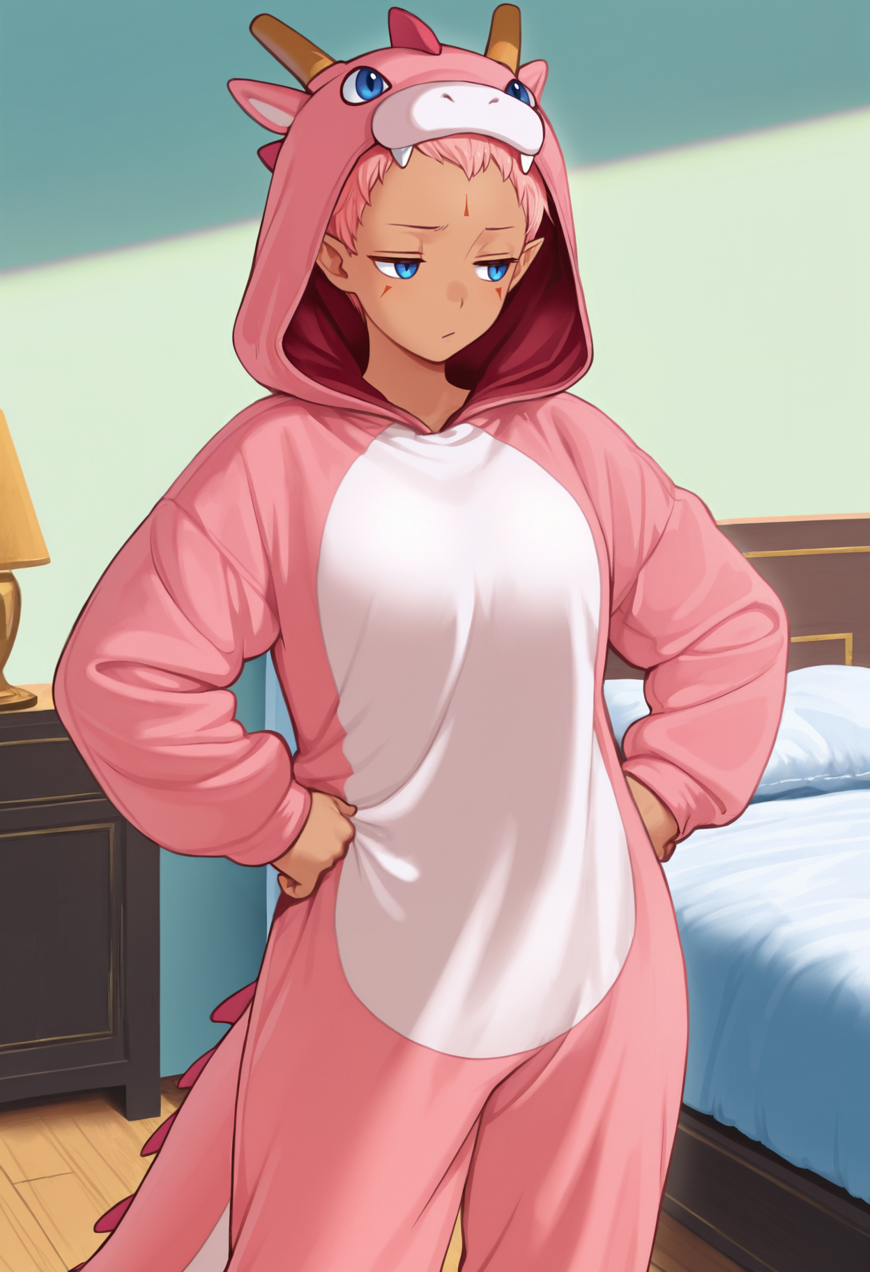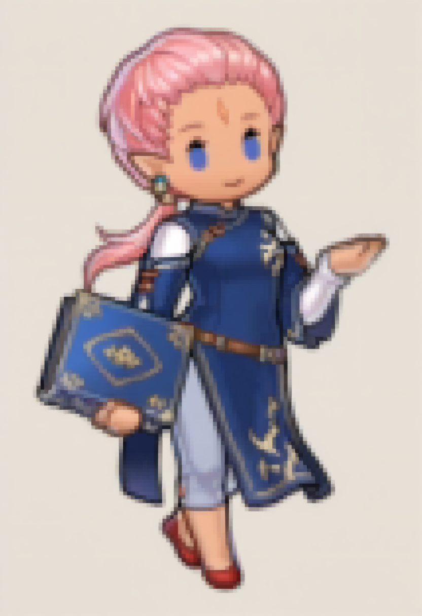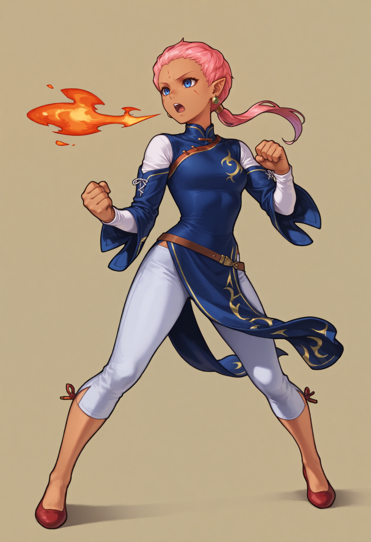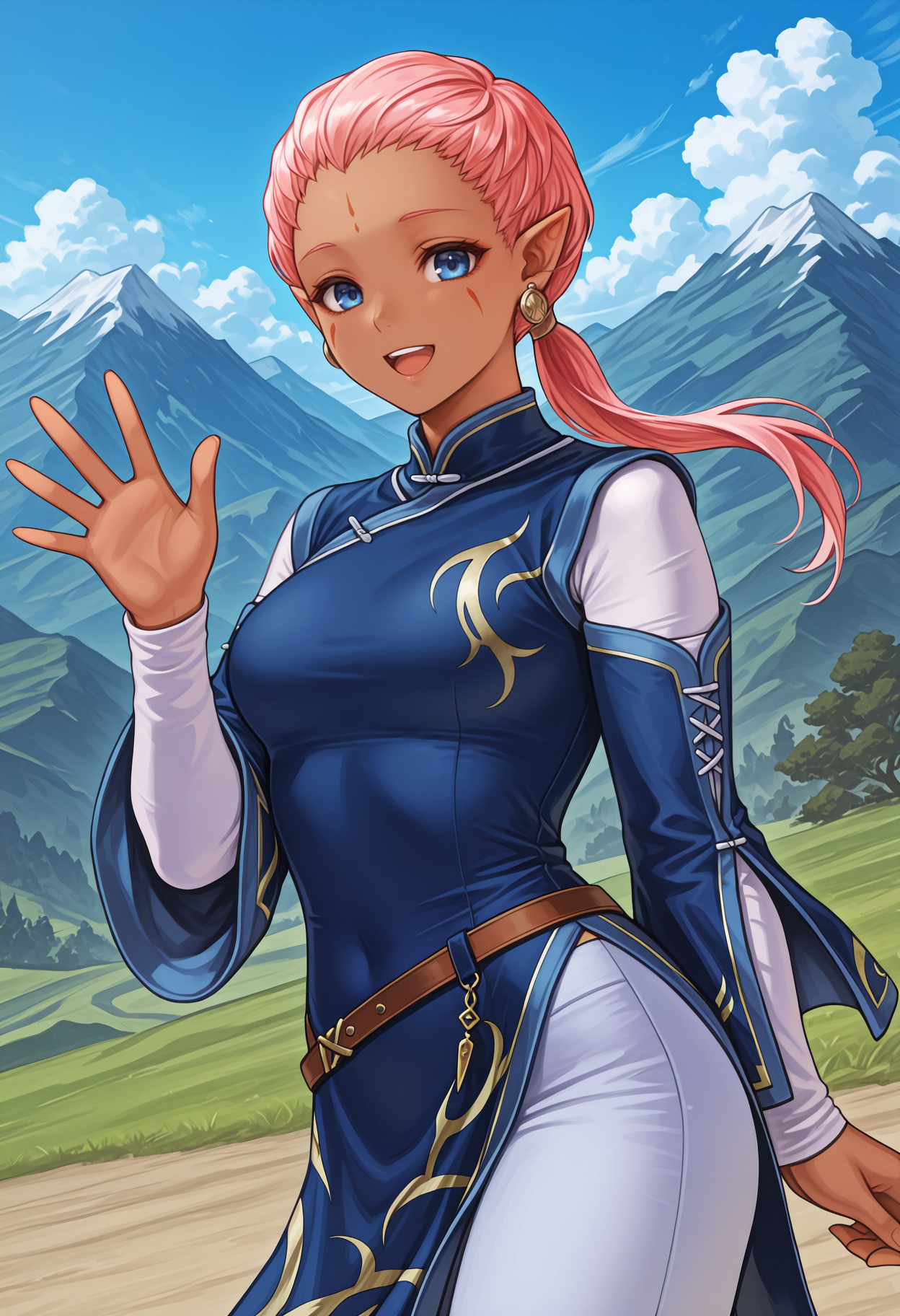 デフォルトの外見: defEna、肌の黒い女性、ピンクの髪、低めのポニーテール、額のマーク、顔のマーク、青い目、尖った耳、イヤリング、青いチャイナドレス、取り外し可能な袖、長袖、重ね袖、茶色のベルト、白いズボン、カプリパンツ、赤いフラットシューズ