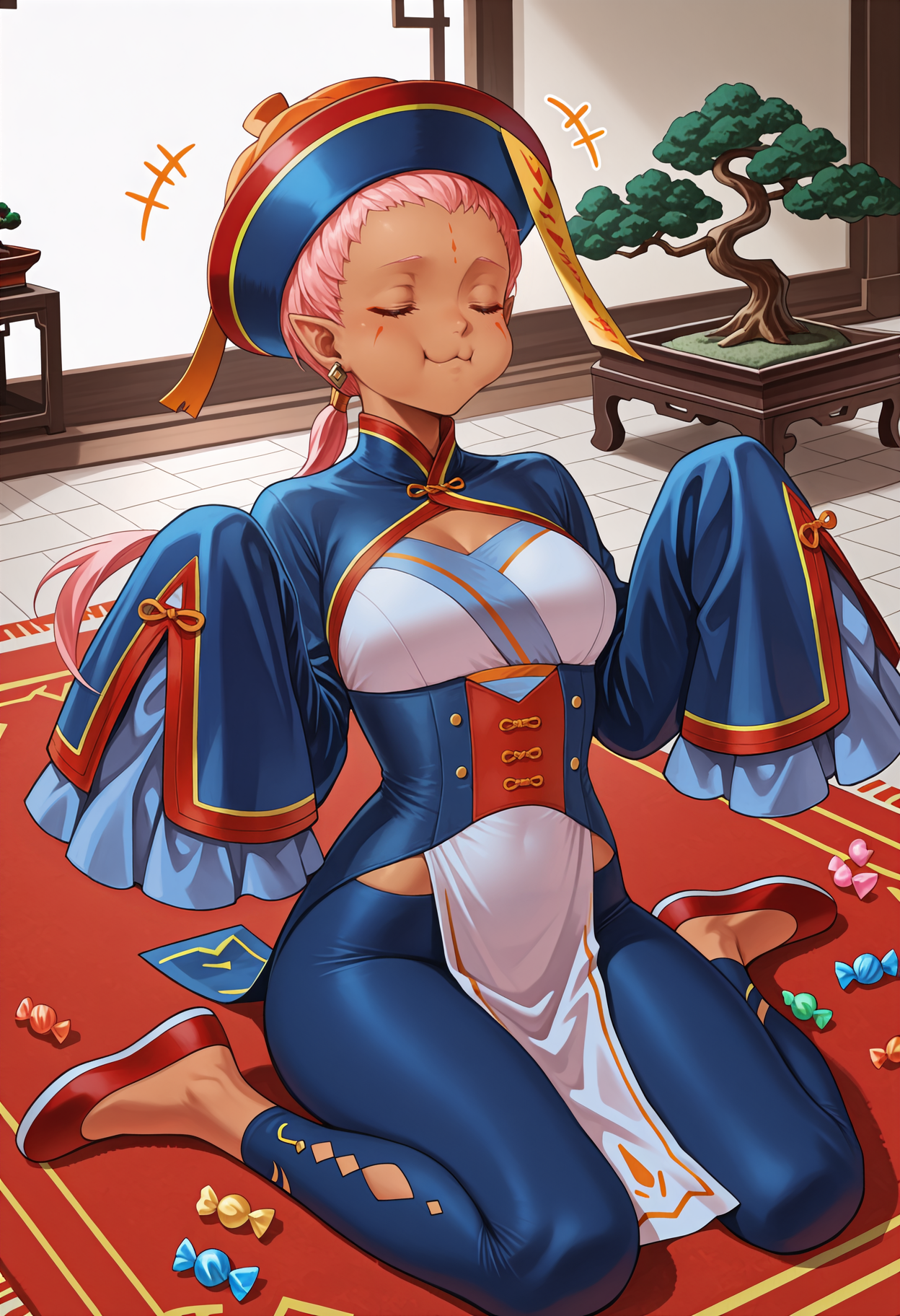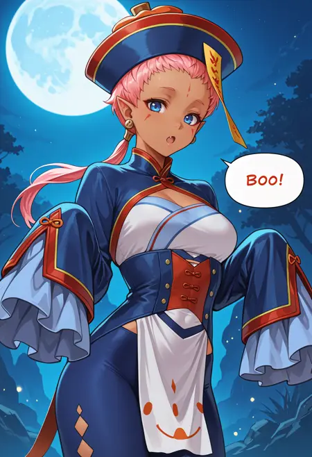 秋の戦術家(FEH): halEna、肌の黒い女性、ピンクの髪、低めのポニーテール、額のマーク、顔のマーク、青い目、尖った耳、イヤリング、qingdai guanmao、おふだ、中国風の衣装、ジャンシ衣装、胸下、広い袖、指より長い袖、白い骨盤カーテン、青いレギンス、フラットシューズ、赤い靴