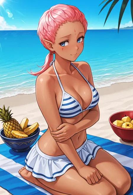 カスタム衣装: defEna、肌の黒い女性、ピンクの髪、低めのポニーテール、額のマーク、顔のマーク、青い目、尖った耳