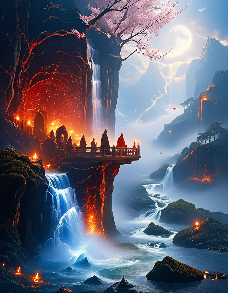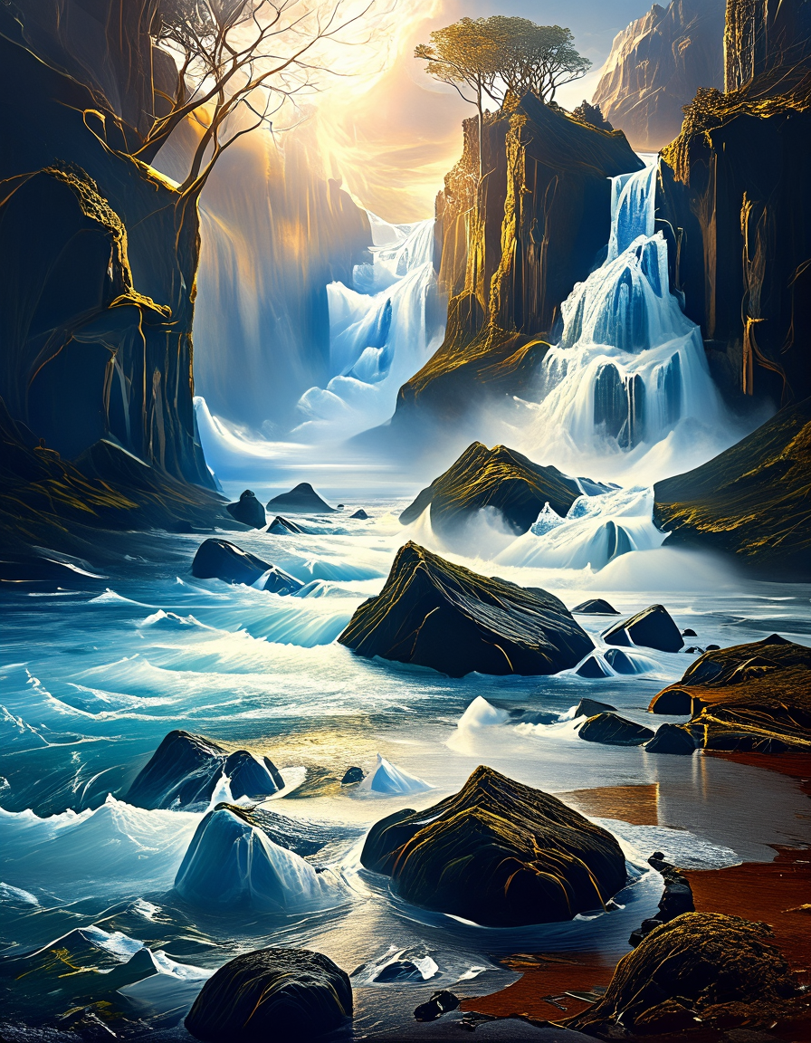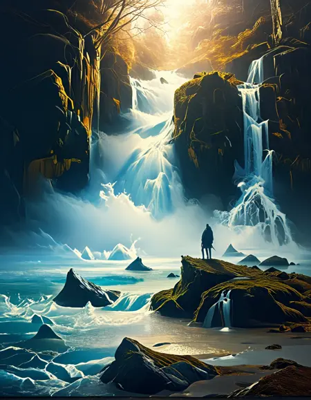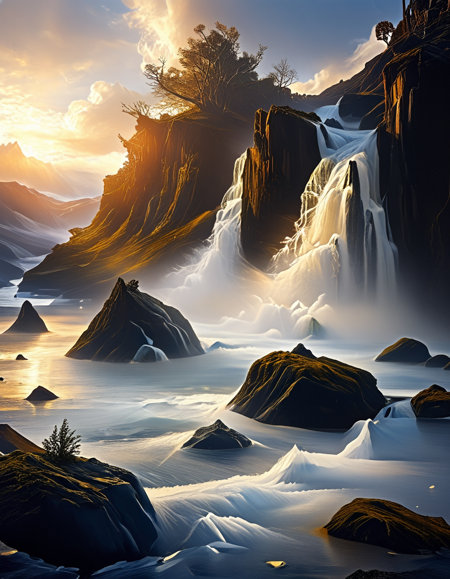 T10, 풍경, 산, 파도, 바위, 나무, 식물, 이끼, 거친 바다, 폭포, 폐허, 일몰, 파랑, 주황, 노랑, 갈색,