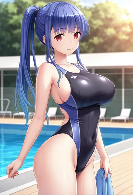 red eyes, blue hair, long hair, ponytail