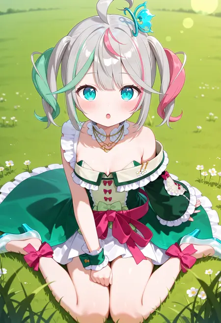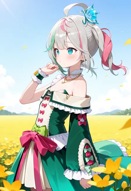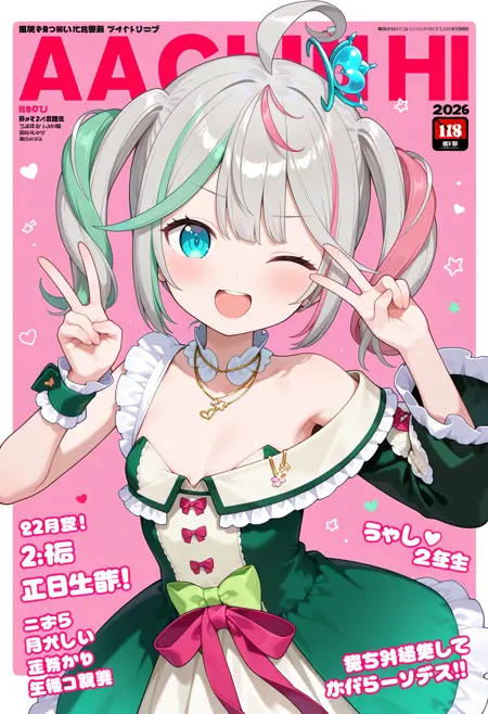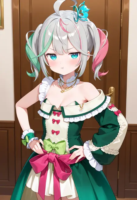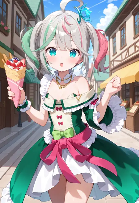outfit1aachumi, multicolored hair, grey hair, twintails, ahoge, hair ornament, frilled choker, necklace, off shoulder, frills, green dress, asymmetrical sleeves, single sleeve, long sleeves, wrist cuffs, pink ribbon, white skirt
