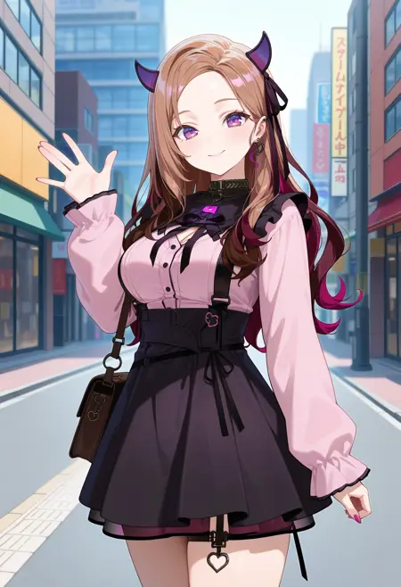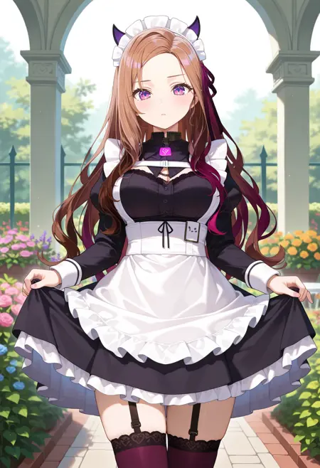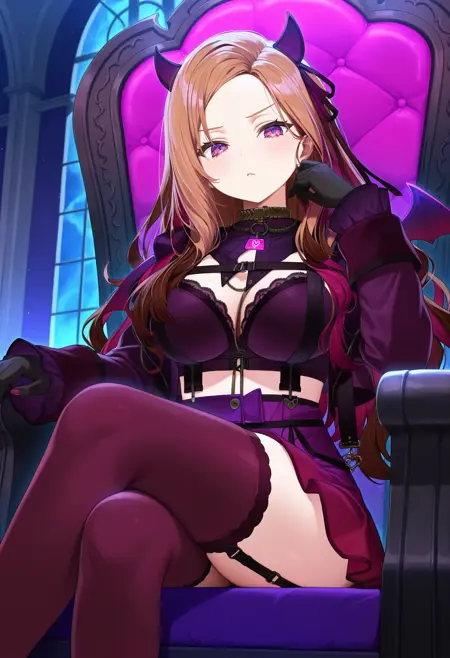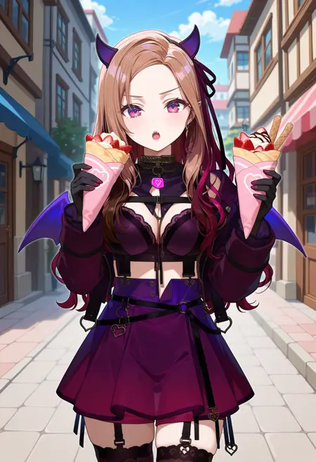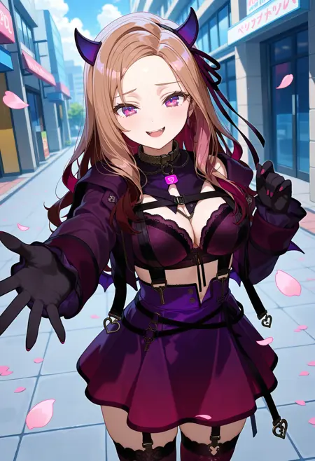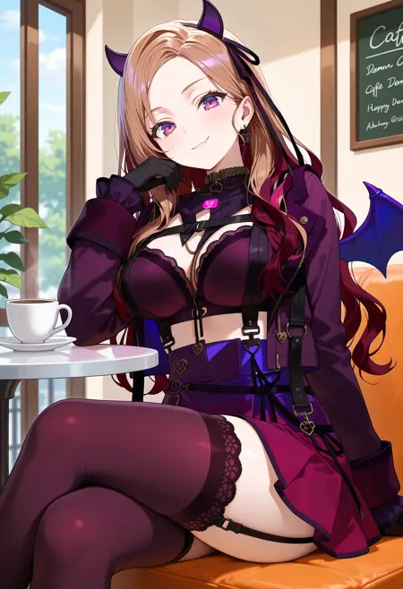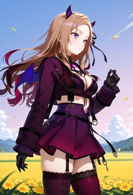 outfit1aabelluna, long hair, multicolored hair, brown hair, horns, hair ribbon, purple eyes, demon wings, collar, lace trim, bra, harness, crop top, purple jacket, long sleeves, black hands, purple skirt, garter straps, thighhighs