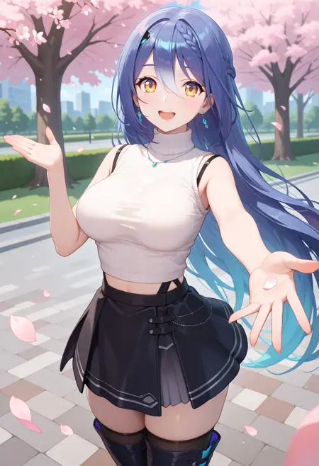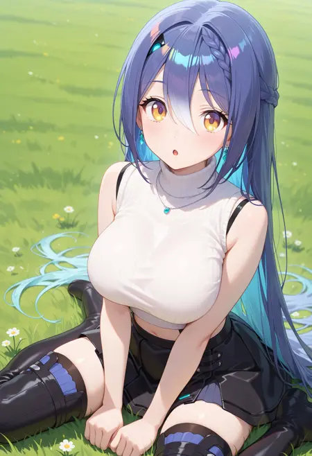 outfit2bbetra, long hair, multicolored hair, blue hair, hair ornament, earrings, necklace, turtleneck, ribbed sweater, white sweater, sleeveless, midriff, black skirt, black thighhighs, thigh boots