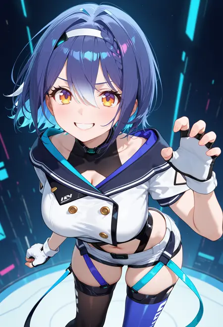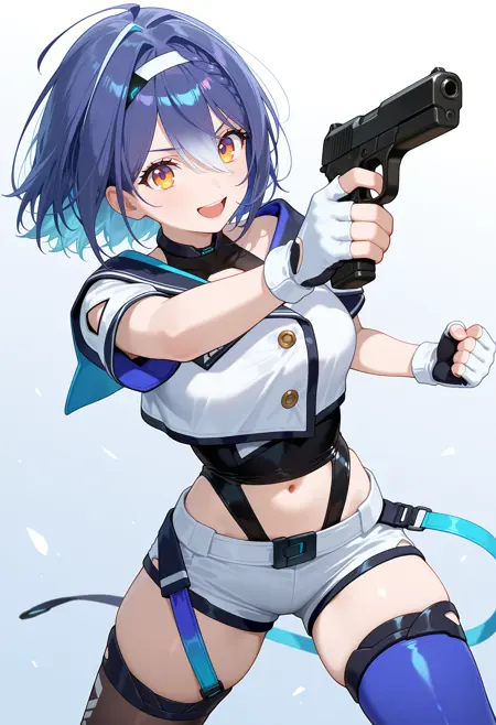 outfit3-2ccetra, short hair, multicolored hair, blue hair, white hairband, hair ornament, leotard under clothes, black leotard, cropped jacket, white jacket, short sleeves, fingerless gloves, white gloves, navel cutout, white shorts, mismatched legwear, blue thighhighs, black thighhighs