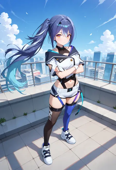 outfit3-1ccetra, long hair, multicolored hair, blue hair, side ponytail, leotard under clothes, black leotard, cropped jacket, white jacket, short sleeves, fingerless gloves, white gloves, navel cutout, white shorts, mismatched legwear, blue thighhighs, black thighhighs