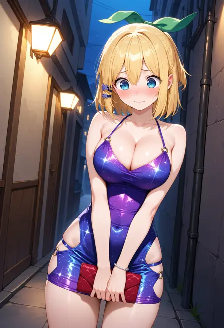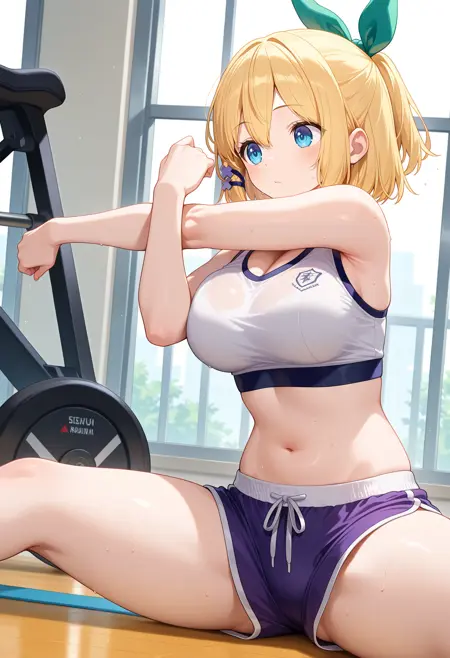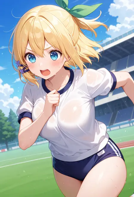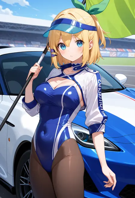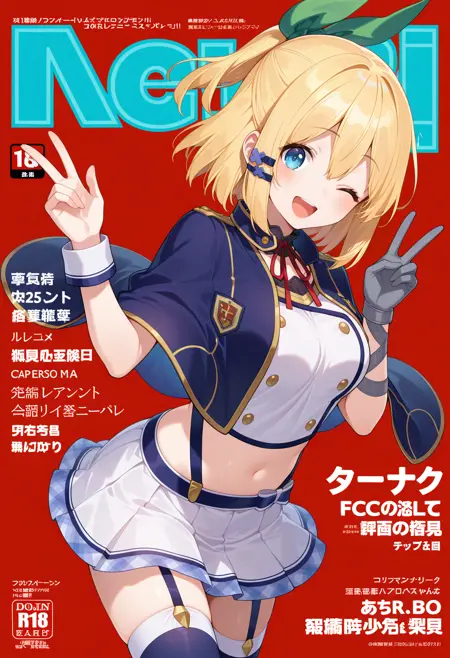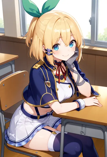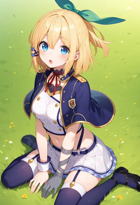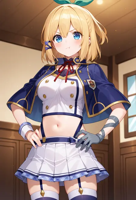 outfit1aarumia, short hair, blonde hair, half updo, hair bow, hair ornament, blue eyes, blue capelet, neck ribbon, crop top, white shirt, wrist cuffs, single glove, grey gloves, suspender skirt, miniskirt, white skirt, garter straps, blue thighhighs