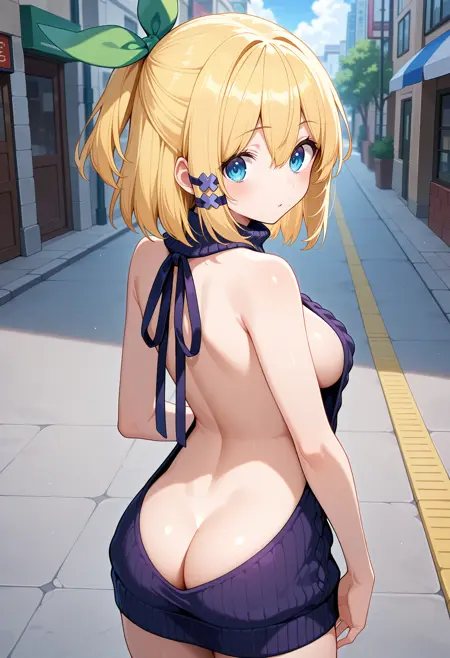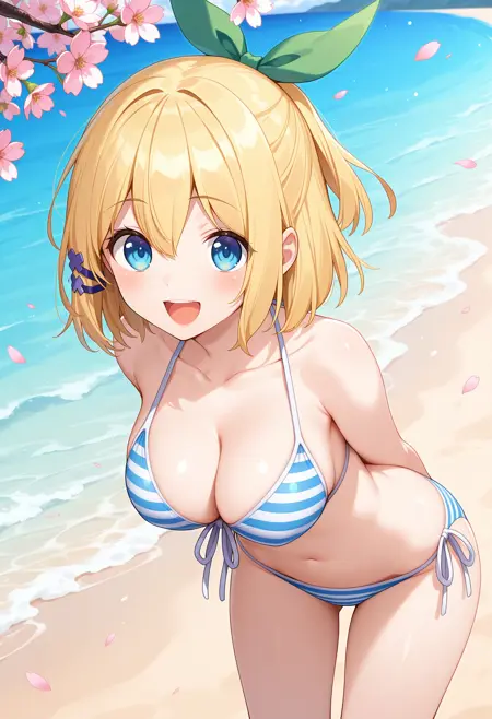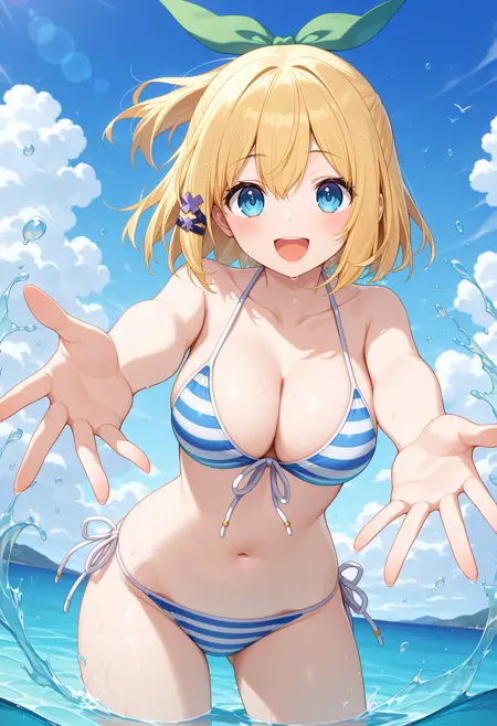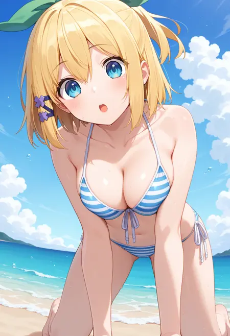 outfit2aarumia, short hair, blonde hair, half updo, hair bow, hair ornament, blue eyes, collarbone, striped bikini, blue bikini