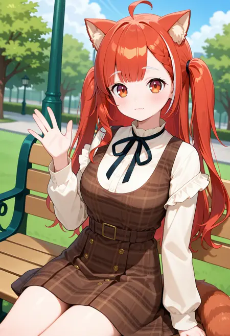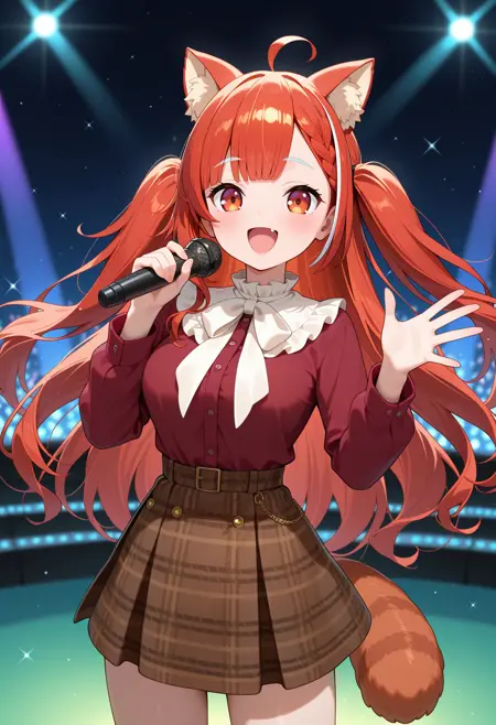 outfit4-3ddpetit, long hair, red hair, two side up, ahoge, animal ears, streaked hair, braided bangs, mismatched eyebrows, orange eyes, tail, frilled collar, white bowtie, red shirt, long sleeves, plaid skirt, brown skirt