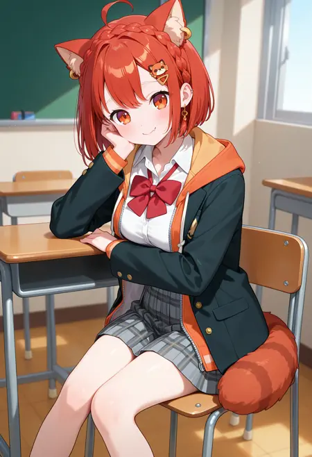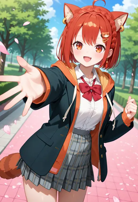 outfit5eepetit, short hair, red hair, braid, ahoge, animal ears, hair ornament, mismatched eyebrows, orange eyes, tail, school uniform, red bowtie, collared shirt, white shirt, hooded jacket, black jacket, long sleeves, pleated skirt, plaid skirt, grey skirt