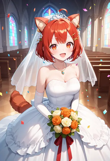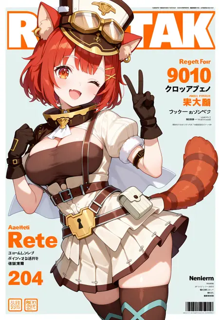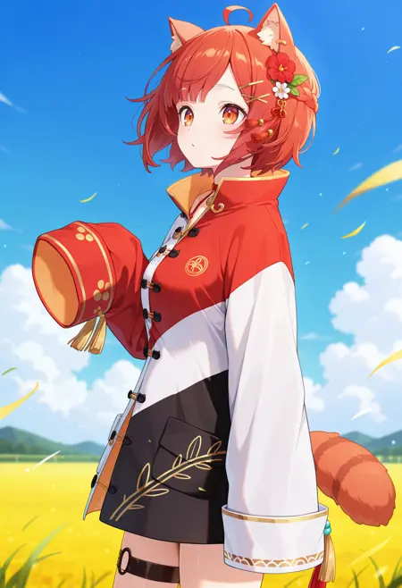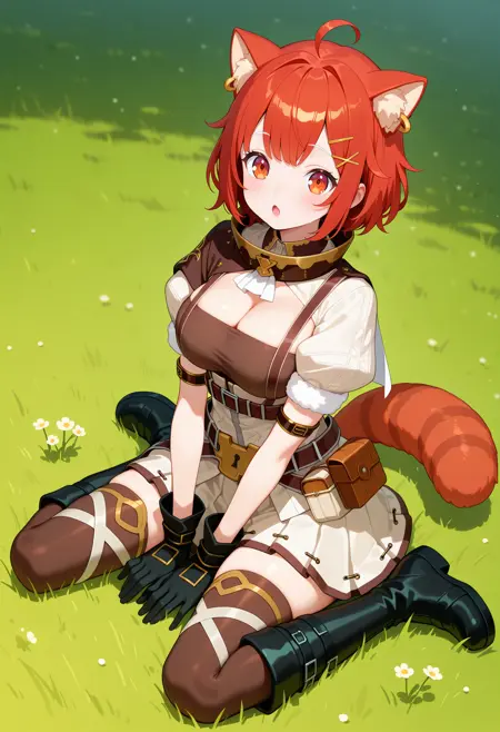 outfit2-1bbpetit, short hair, red hair, ahoge, animal ears, hair flower, hairclip, mismatched eyebrows, orange eyes, tail, red choker, multicolored jacket, long sleeves, sleeves past wrists, thigh strap
