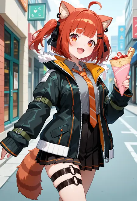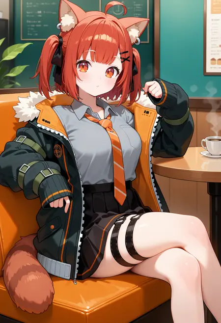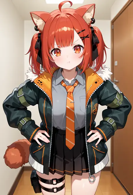 outfit3ccpetit, short hair, red hair, two side up, ahoge, animal ears, hair ribbon, hairclip, mismatched eyebrows, orange eyes, tail, orange necktie, collared shirt, grey shirt, fur trim, black jacket, long sleeves, sleeves past wrists, pleated skirt, black skirt, thigh strap